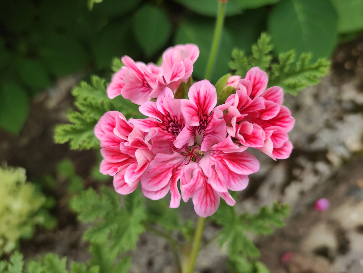 Цветки «Энджелс Парфюм» (Pelargonium hybrid ’Angel’s Perfume’) в точности повторяют соцветия нежной пеларгонии «Ангела». Они среднего размера, темно-бардовые с розовым и белым. Цветение обильное. Этот сорт остается миниатюрным, вырастая всего до 30 см в высоту и столько же в ширину.