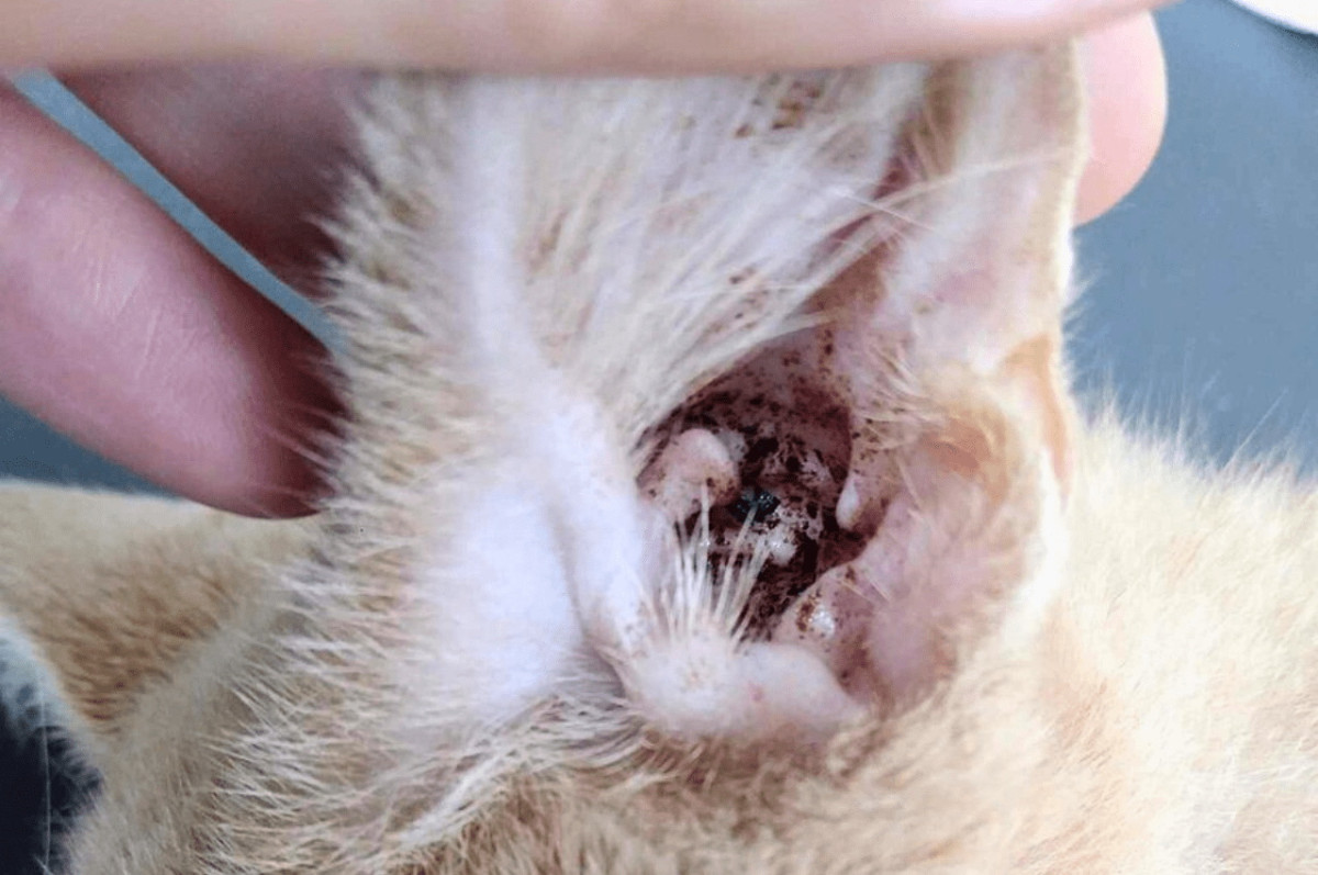 - Красновато-коричневые выделения из ушных раковин и корки в них — это самый яркий симптом заражения ушным клещом.