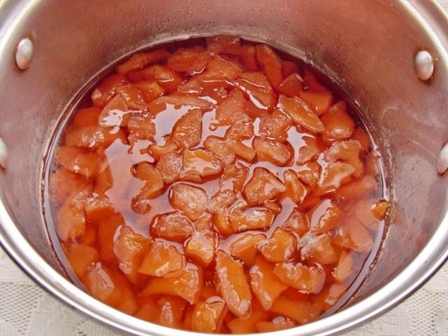Нарезаем заваренную айву кубиками или ломтиками одинаковой толщины и опускаем в кипящий сахарный сироп. Вновь доведя до кипения, уменьшаем огонь и провариваем 5 минут. Затем снимаем с огня и оставляем на 3-4 часа до полного остывания, в идеале – на ночь.