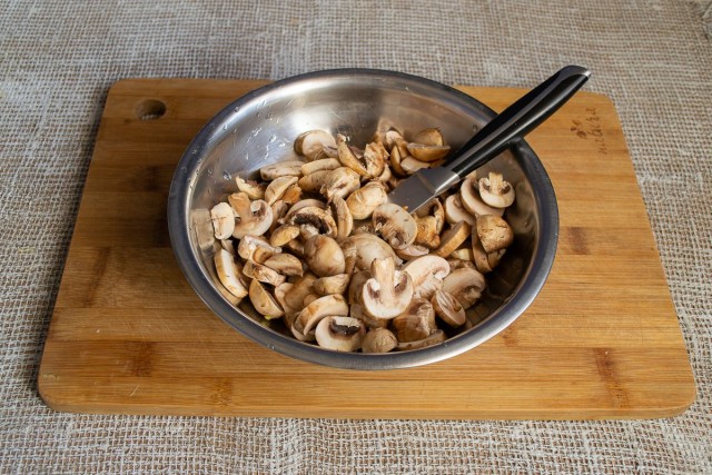 Начинаем с подготовки продуктов для начинки. Свежие шампиньоны обтираем салфеточкой или промываем проточной холодной водой, очищенные грибы нарезаем тонкими ломтиками.