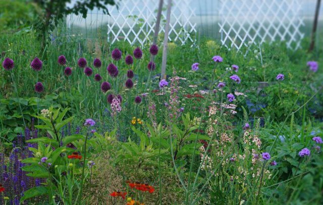 Его соседями стали вербена бонарская, лук круглоголовый, рудбекия и тысячелистник. Но особенно мне понравилось, как живописно он смотрелся с посконником, образуя нежные переходы оттенков лилового.
