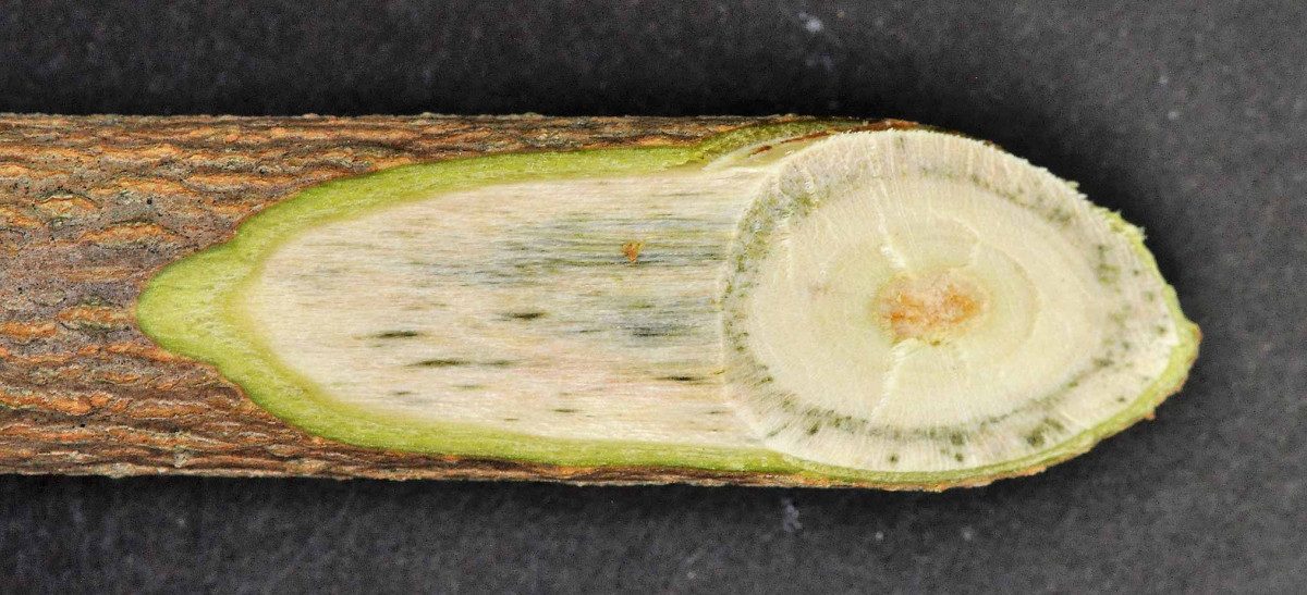 При снятии коры на поврежденных областях наблюдаются темные коричневые полосы. Подобные признаки прежде всего характерны для калины и клена, но могут отсутствовать у ясеня и сирени. Проводящая ткань на срезах ветвей выглядит как темное кольцо или точечные пятна. Эти изменения цвета древесины могут помочь вам отличить вертициллезное увядание от других заболеваний растений.