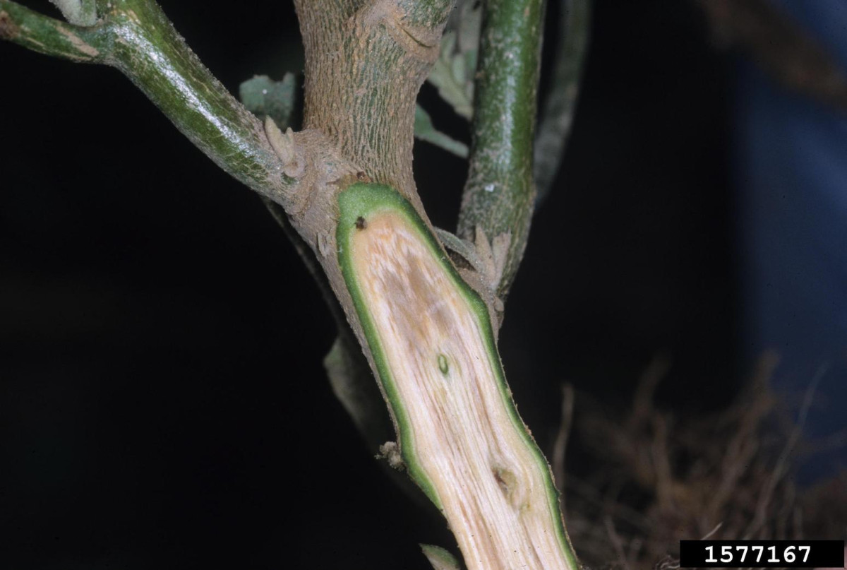 Пораженная ткань растения некротизируется, поскольку сосудистая система забивается мицелием, и продуктами метаболизма гриба. В итоге это приводит к блокировке движения воды по сосудам растений и в конечном итоге становится причиной увядания. Именно некротическая ткань выглядит как темные полосы, по которым можно определить болезнь.