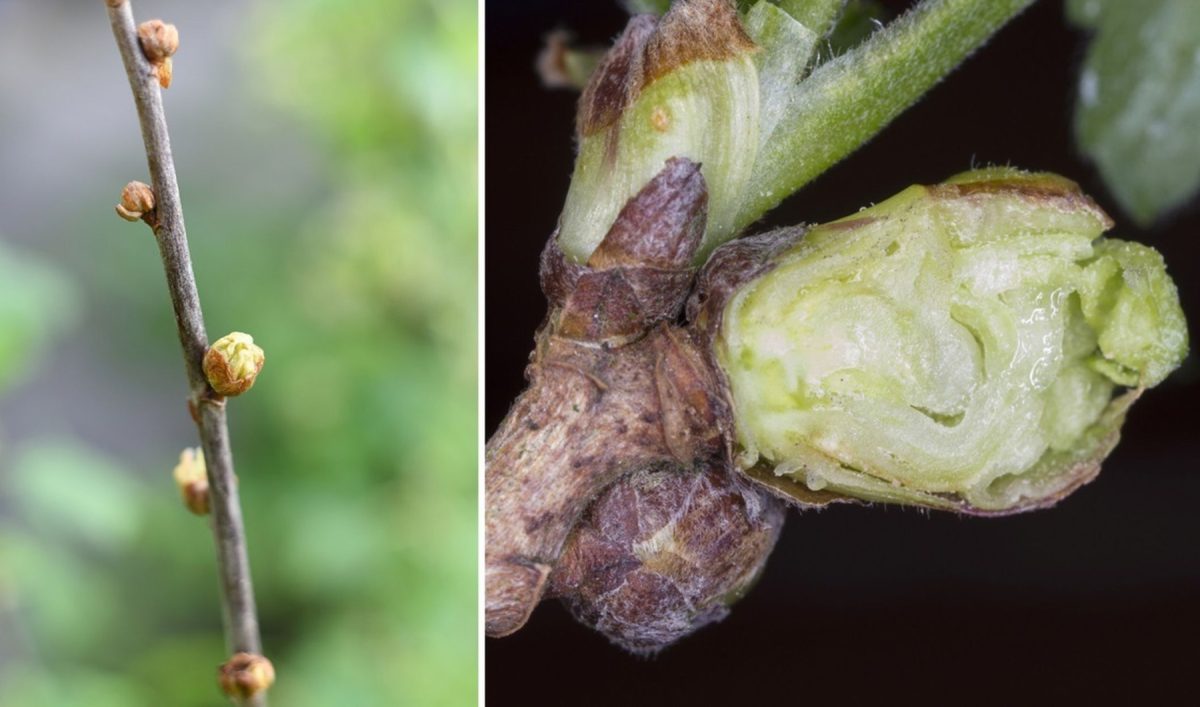 Особое внимание обратите на почки. Если часть из них выглядит раздутой, округлой, заметно крупнее остальных, это почковый клещ. Он зимует внутри почек и весной начинает активно размножаться. Поражённые почки не распустятся нормально, урожая с них не будет, а клещ расползётся на здоровые части куста. Одна такая почка может содержать до 3-8 тысяч клещей. Представьте, что будет, если оставить их на кусте.