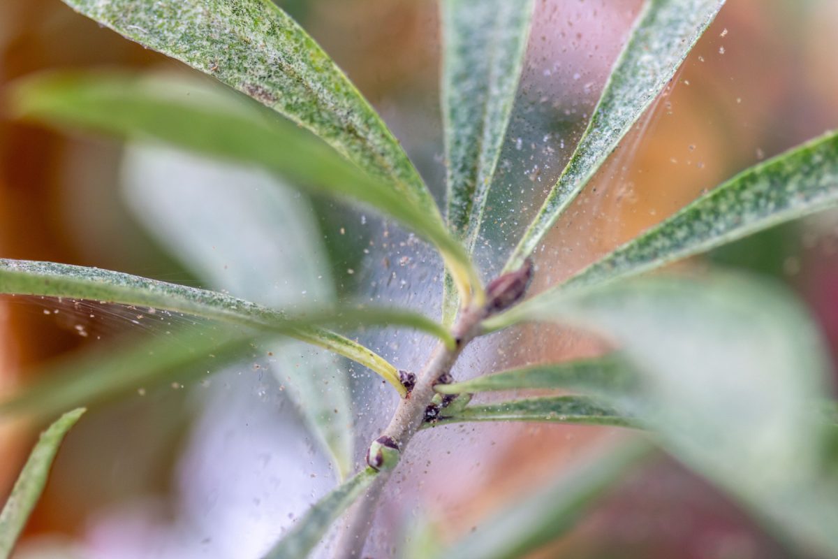 Паутинный клещ первым реагирует на сухой тёплый воздух. Колонии образуются на нижней стороне листа – там, где клещи прокалывают ткань и высасывают клеточный сок. Особенно охотно заселяет фикусы, орхидеи, антуриумы, пальмы, розы, огородные культуры на подоконнике. На мягких суккулентах его встретишь реже.