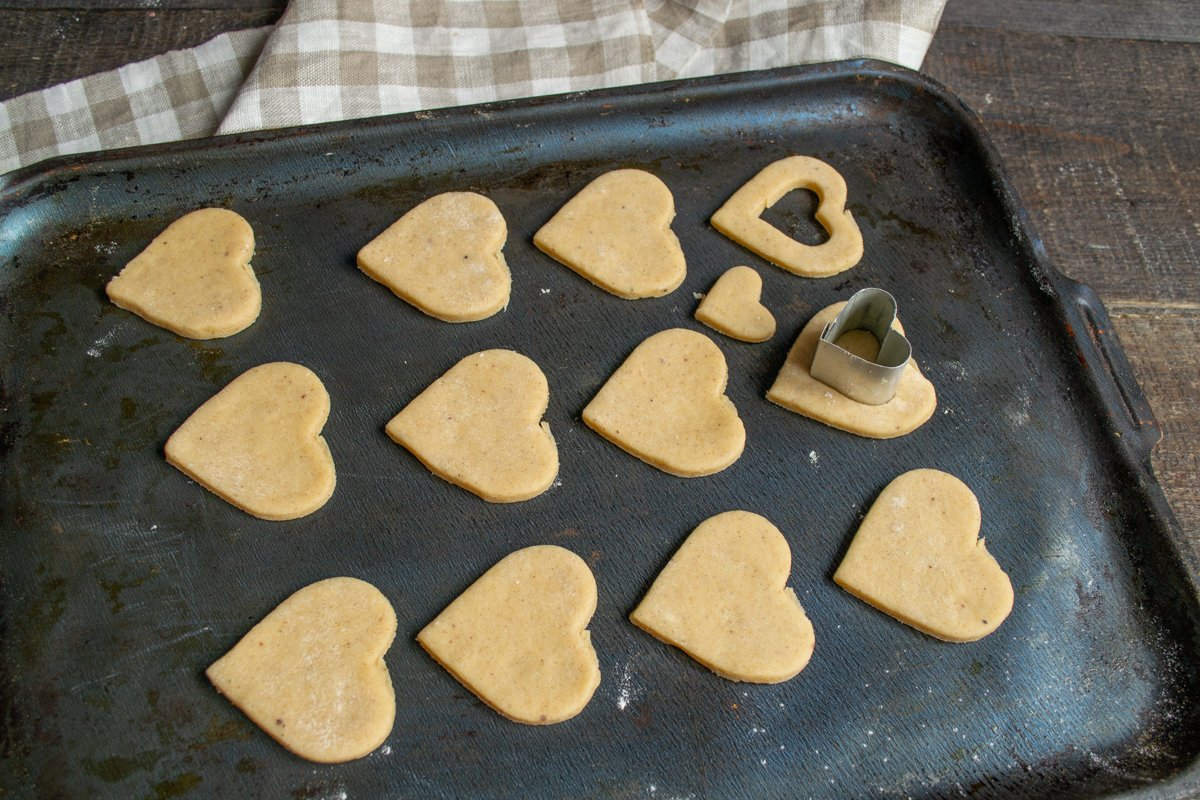 Перекладываем вырезанные сердечки на противень, кладём на небольшом расстоянии друг от друга. Маленькой формочкой вырезаем серединки, малюсенькие сердечки кладём между большими печеньями.