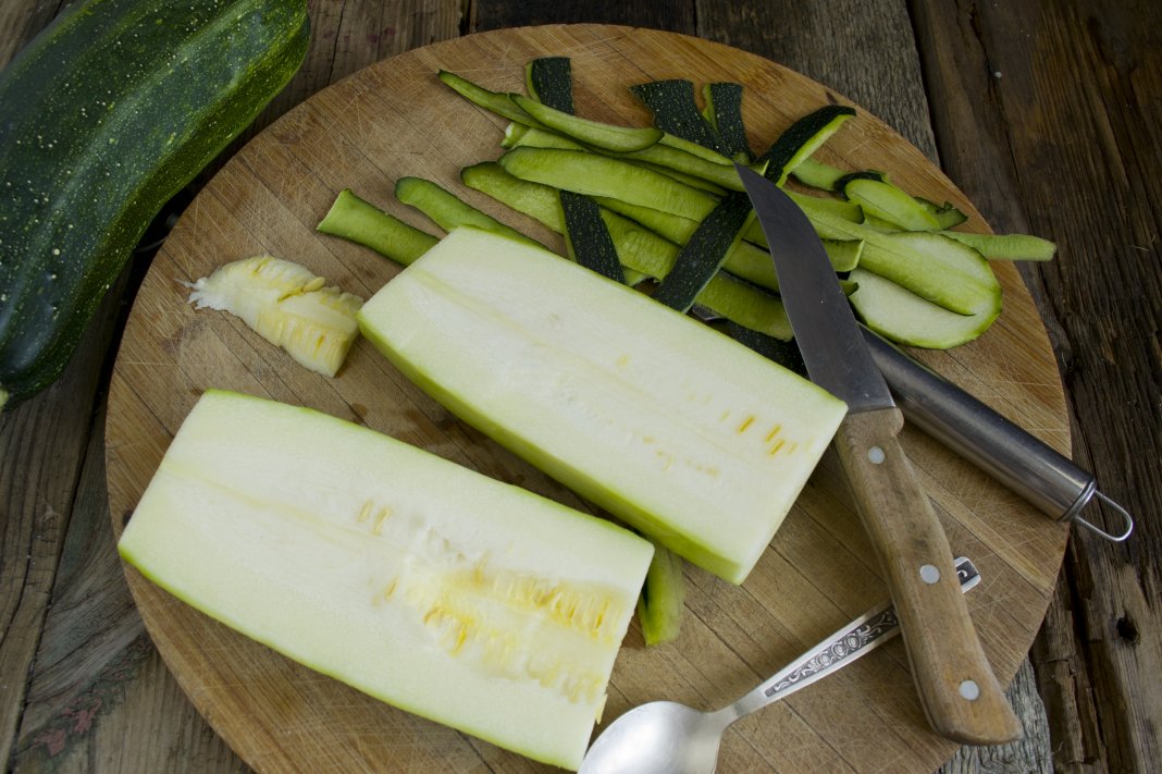 Скребком для чистки овощей снимаем тонкий слой кожуры. Разрезаем кабачок пополам, выскребаем ложкой серединку с семенами и рыхлой мякотью. На ранней стадии зрелости, когда овощи весят не более 200 г, чистить от семян и кожуры не нужно.