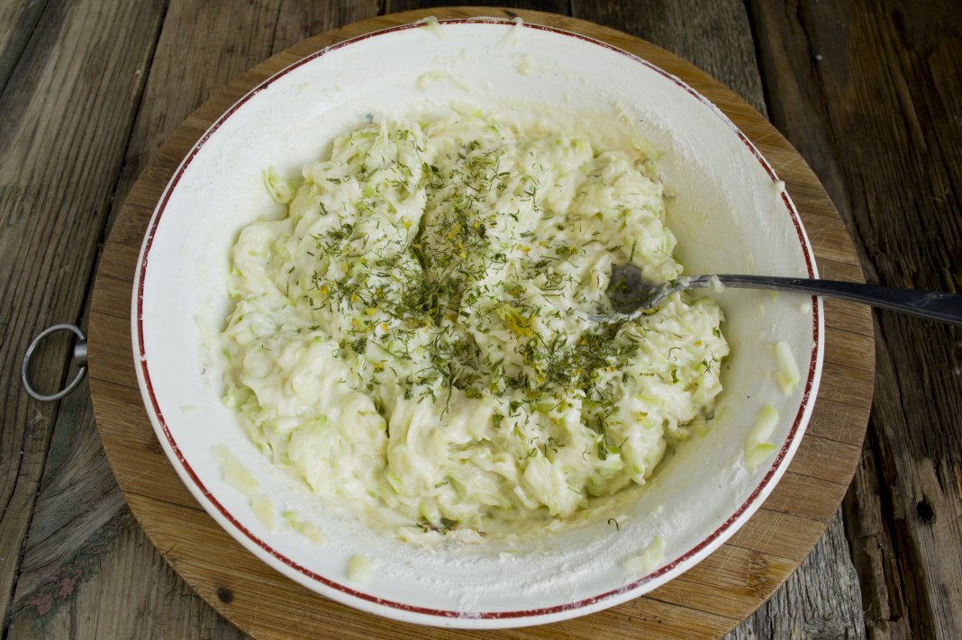 Замешиваем достаточно густое тесто, добавляем сушеные травы – укроп и петрушку, они отлично дружат с кабачком. На этом этапе пробуем тесто и, при необходимости, добавляем мелкую поваренную соль по вкусу.