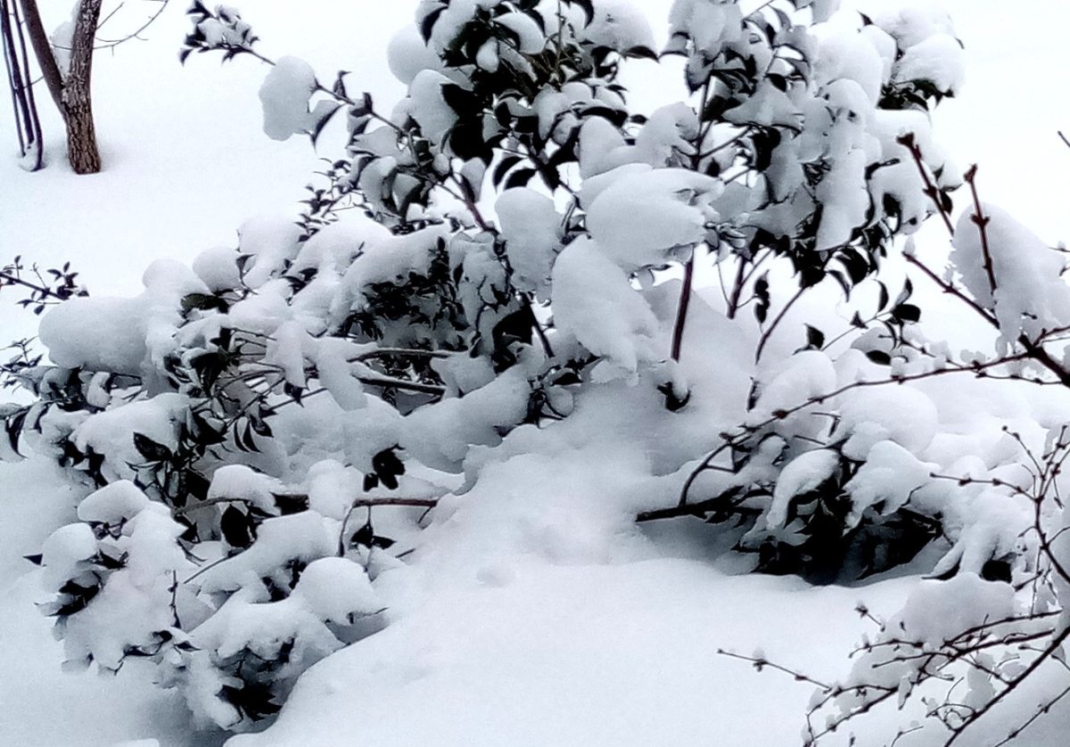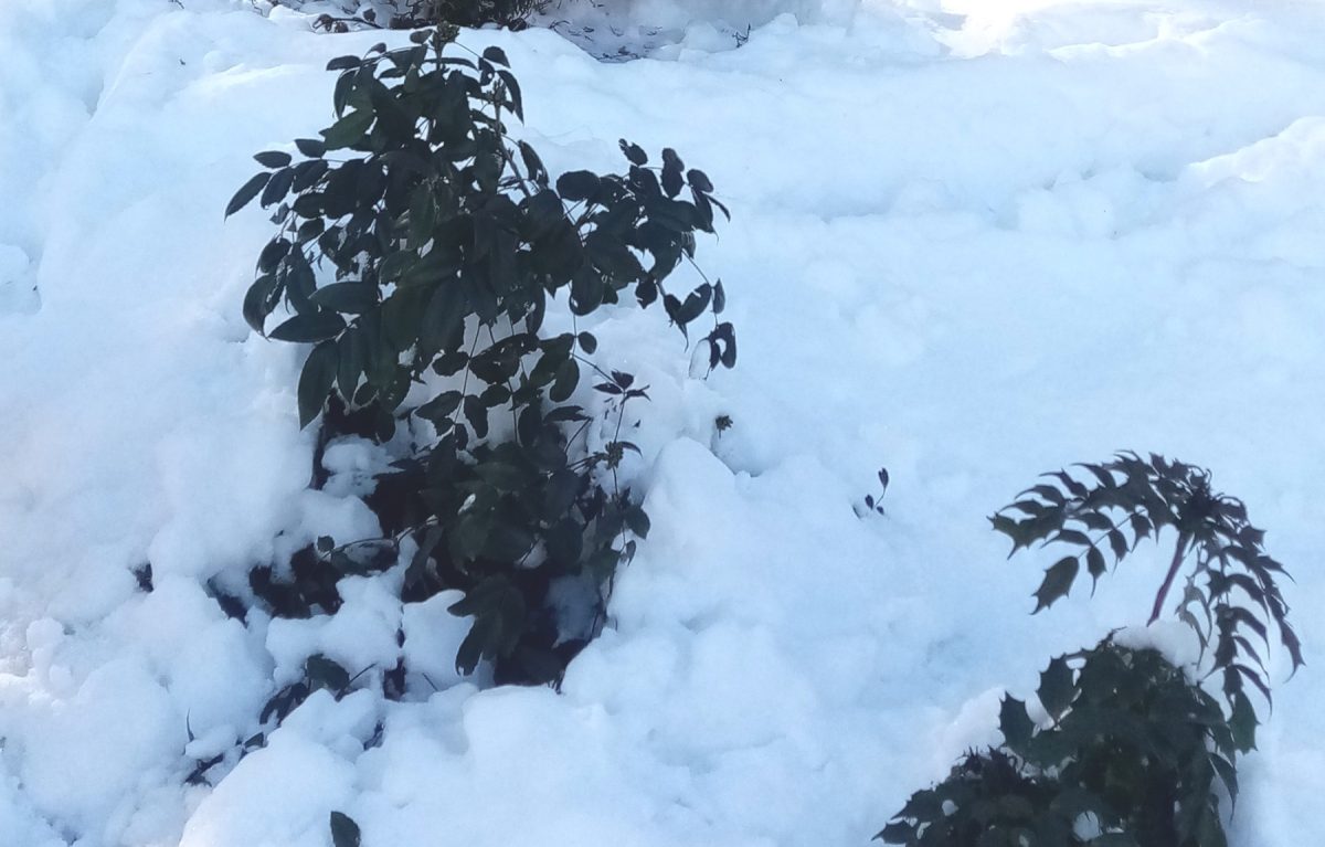 Магония падуболистная (Mahonia aquifolium) зимой держится как стойкий оловянный солдатик. Рост у неё вполне кустарниковый, листва жёсткая, тёмно-зелёная, с острыми зубчиками (зато никто не объедает!), при сильных морозах приобретает красно-бордовые оттенки. Весной, с распусканием шапок жёлтых ароматных цветочков, снова зеленеет.