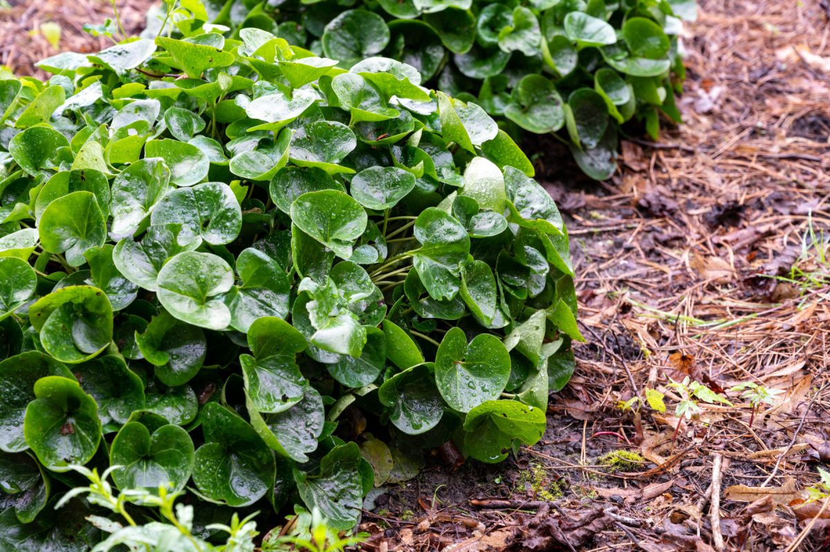 Копытень европейский (Asarum europaeum) вообще зимой и летом одним цветом — как ушёл под снег зелёным и блестящим, таким же и вышел.