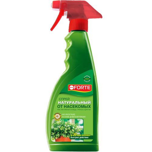 Поэтому средство от вредителей для комнатных растений желательно использовать на основе натуральных инсектицидов. К таким, в частности, относится спрей Bona Forte. Он производится из концентрата натурального пиретрума (экстракта далматской ромашки). Действует этот препарат молниеносно – в течение нескольких часов наблюдается гибель наиболее активной части популяции (взрослых особей и личинок). Под действием света пиретрум быстро разлагается до безопасных соединений.