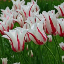 - бело-красный, с неравномерными штрихами карминного на белом фоне тюльпан сорта «Ice Follies» и похожий на него «Sorbet»;