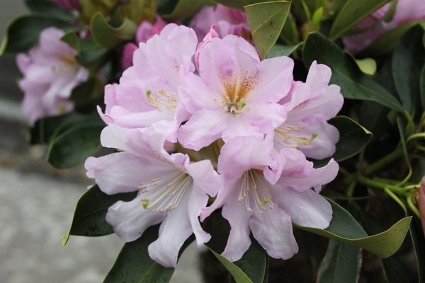 Классика среди розовоцветковых рододендронов – крупноцветковый гибрид ‘Furnivall’s Daughter’. Соцветия этого нежного гиганта кажутся идеальными сферами, а яркий центр с красивыми тычинками только подчеркивает красоту нежного холодного окраса лепестков.