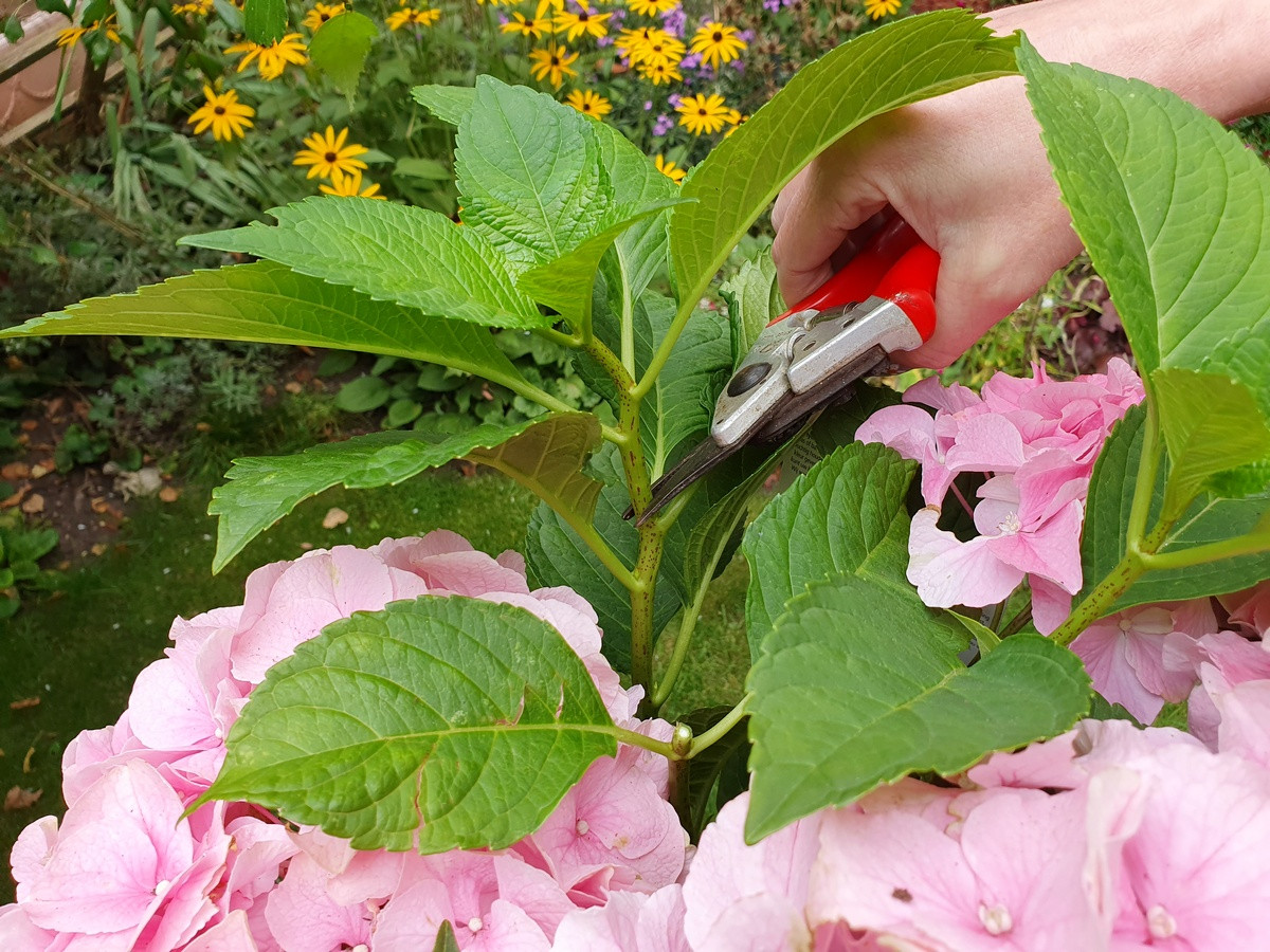 Срезая ветвь у древовидной гортензии, не укорачивают ее «на кольцо», но оставляют для развития боковых побегов 3–4 нижних узла. У метельчатой гортензии срезают прошлогодние побеги на 1/3 длины. Срез производят по косой.