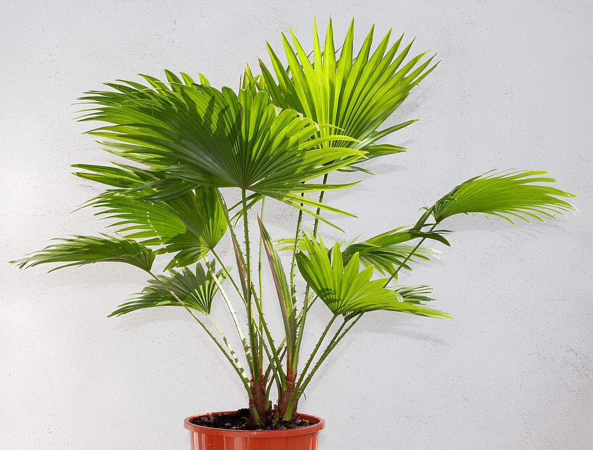 Похожа на ливистону китайскую, но ее листья еще крупнее и более округлые. Сегменты листа широкие, с поникающими кончиками. Черешки длинные, покрыты мелкими шипами. Выглядит очень тропически и эффектно. Однако это одна из капризных пальм: требует высокой влажности воздуха и постоянного внимания.