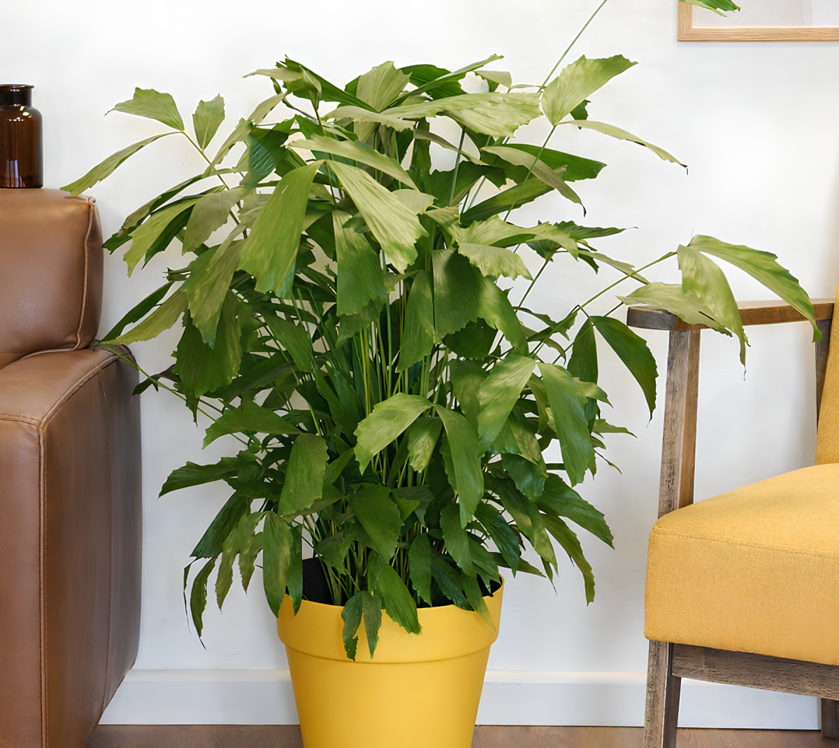 Арека выглядит как пышный пучок желтовато-зеленых стеблей с богатыми перистыми листьями. Стебли гладкие, с характерными кольцами и золотистым оттенком. Листья длинные, изящно изогнутые, приятного светло-зеленого цвета. Когда ареки много, она создает эффект настоящего леса. Растение очень популярно в офисах, отелях и торговых центрах, потому что выглядит презентабельно и заполняет пространство мягко, без агрессии.