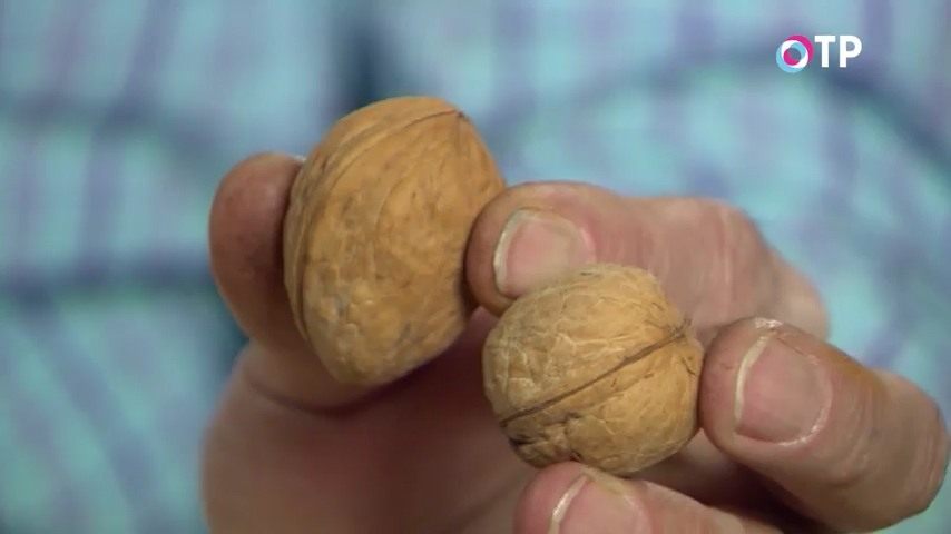 Есть среди этих орехов грецкий орех, который вы хорошо очень знаете, да? Грецкие орехи. Для сравнения просто я принёс их.