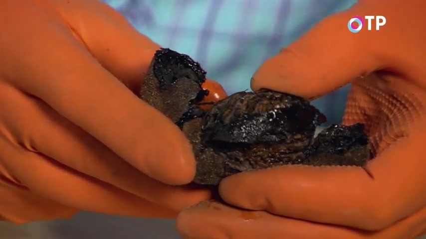 Вот так вы его вскрываете, видите, да? Вот таким образом. Отделяете, промываете. Как следует промываете. Просушиваете этот орешек. Вот он. Аккуратно, очень аккуратно, потому что пальцы потом можно неделю не отмыть ничем.