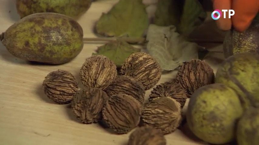 Аналогичное по красоте дерево – это бархат, бархат амурский. Это не орех, имеет вот такие сложные соцветия, а потом и соплодия. Вы просто собираете среди листвы так же, как эти орехи, сейчас можете найти. Просто на листве, под листвой, которая опала, и те, и другие культуры.