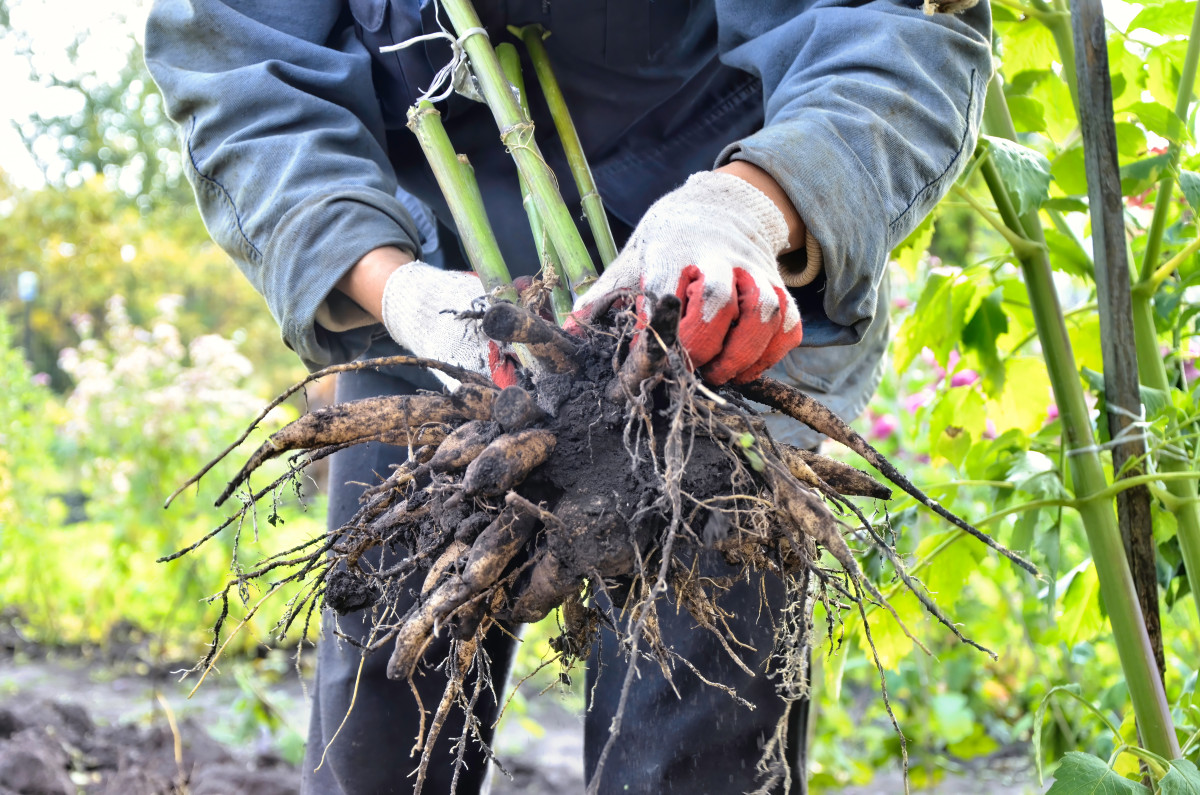 После того, как вы выкопали клубни, осторожно стряхните с них лишнюю грязь и отложите в сторону. Так проделайте со всеми георгинами на участке.