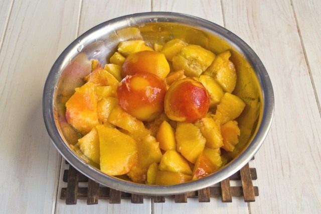 Очищенные персики разрезаем пополам, затем на 4 части, удаляем косточки. Затем нарезаем кубиками размером 1.5-2 сантиметра.