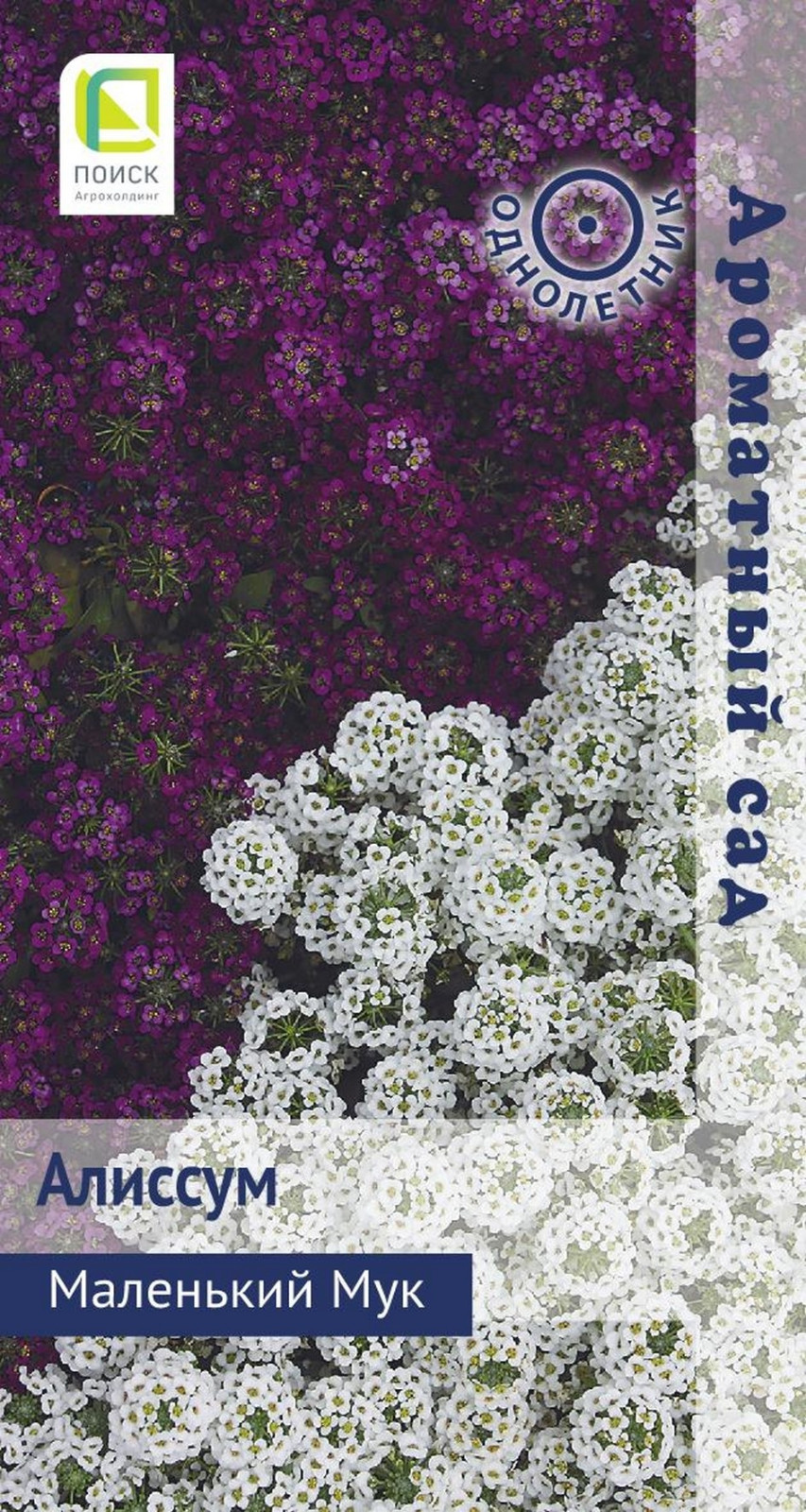 Контрастная смесь с медовым ароматом. Алиссум Маленький Мук — астения низкорослые, высотой до 15 см. Образуют плотный, стелющийся бело-фиолетовый ковер. Цветение с июня до осени. Используют для обрамления клумб, балконных ящиков, на каменистых горках, рокариях, для посадки между плитками дорожек.