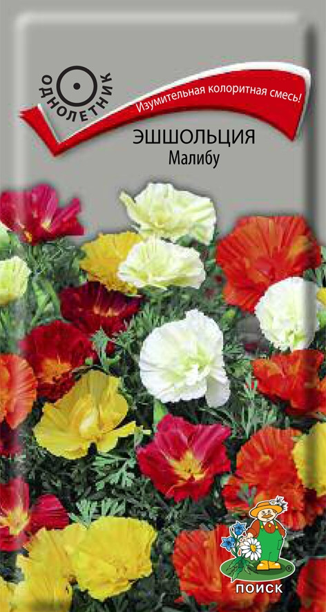 Изумительная колоритная смесь! Компактное растение высотой 25 см. Цветы махровые и полумахровые, с гофрированными лепестками, разнообразной окраски. Смесь состоит из чистых окрасок – белой, желтой, красной, оранжевой. Эшшольция Малибу цветет обильно на протяжении всего лета. Используют для клумб, рабаток, каменистых горок.