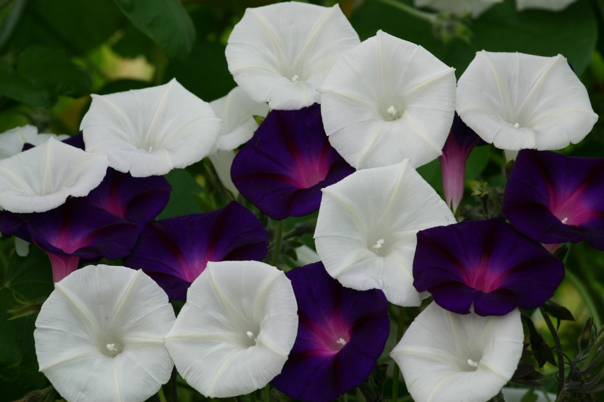 Лиана с цветками-граммофонами. Стебли достигают длины до 2,5 м. Цветки крупные белые и тёмно-фиолетовые со звездой, воронковидной формы диаметром 8-10 см. Ипомея Танец теней цветет обильно с июля по октябрь. Широко используют для вертикального оформления цветников.