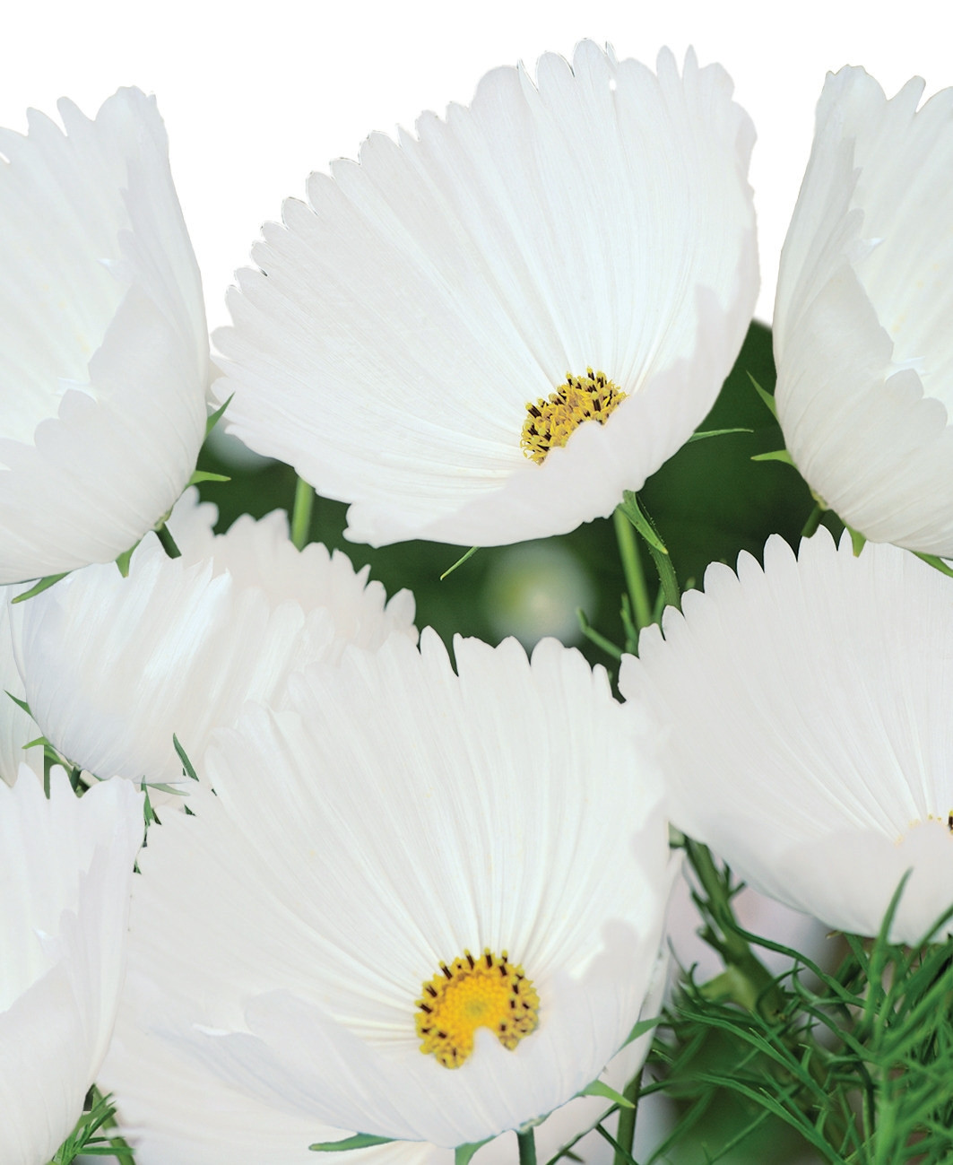 Уникальная форма цветка! Новая форма цветка, в виде чашечки из сросшихся лепестков. Высота растения – 100 см. Окраска цветка – снежно-белая. Космея Мадмуазель цветёт с середины лета до заморозков. Великолепно смотрится на клумбах и в бордюрах, особенно большими массивами. Прекрасное растение для срезки.