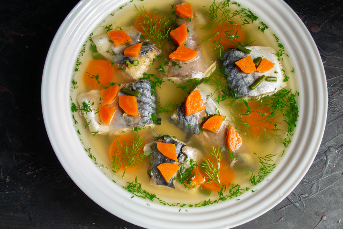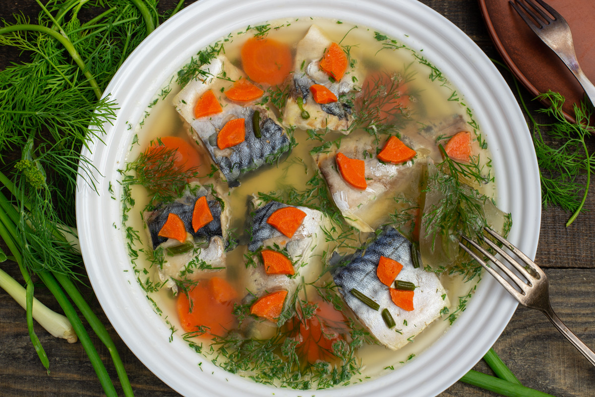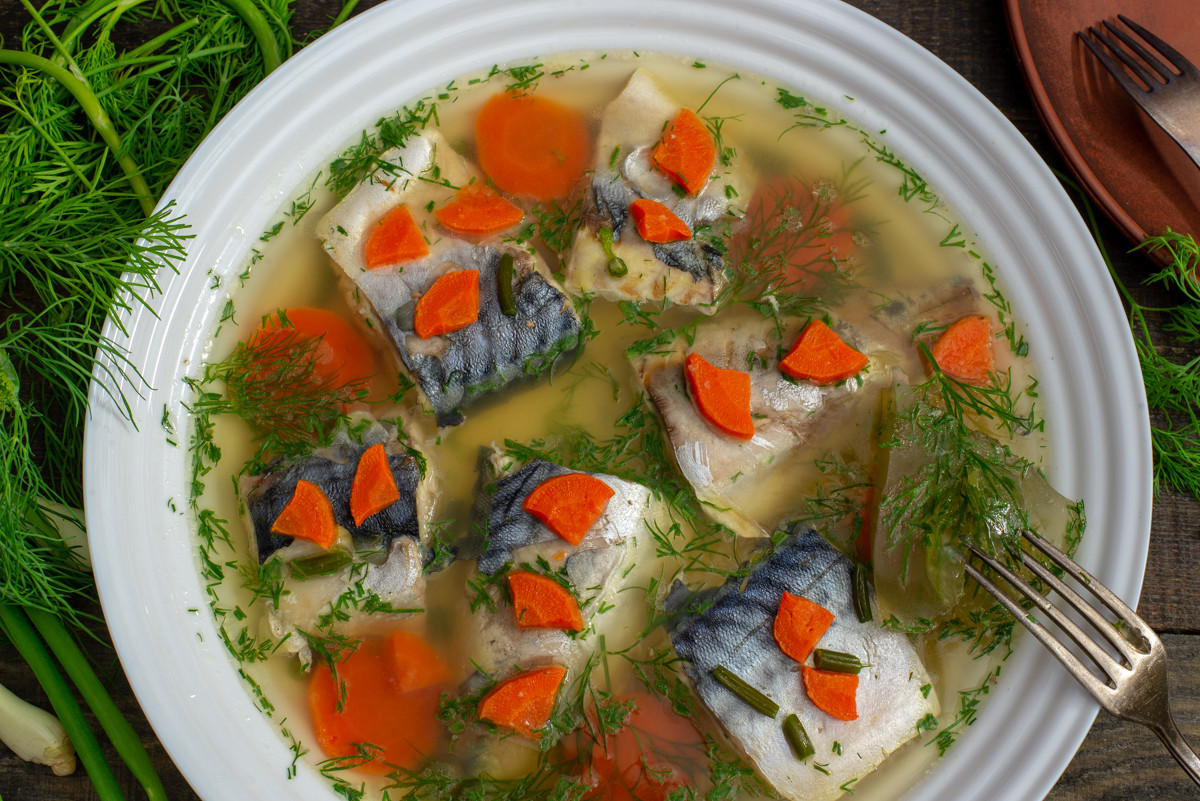 Заливное из скумбрии — вкуснейшая холодная рыбная закуска, на приготовление которой не нужно тратить много сил и денег. В этом рецепте желирующая добавка — порошковый желатин, его нужно предварительно замачивать для набухания примерно на полчаса. Желе получается вкусным, не резиновым. В жаркую пору года рыбное заливное можно подавать как основное блюдо — легко и вкусно! Ну, а зимой такая закуска будет уместной даже на праздничном столе.