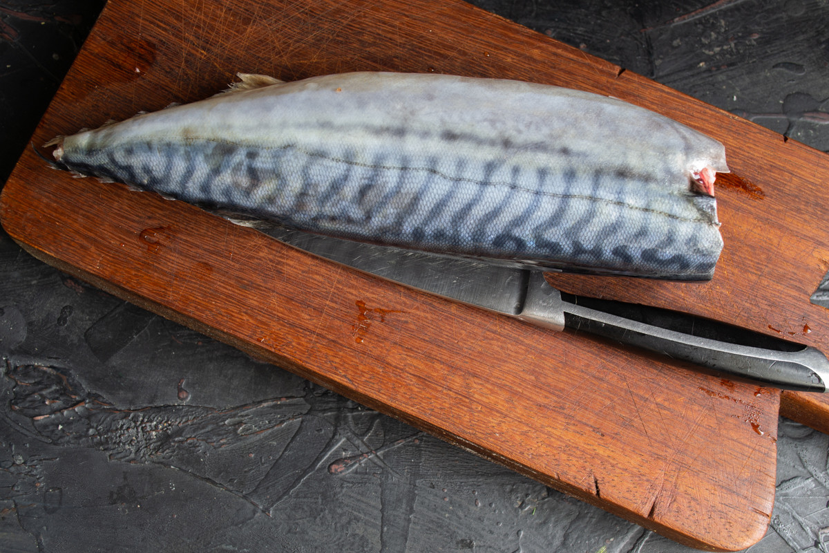 Чистим рыбу. Отрезаем хвост и голову, разрезаем брюхо. Удаляем внутренности, тщательно промываем тушку скумбрии проточной холодной водой. Замороженную рыбу следует заранее достать из морозильной камеры и оставить на нижней полке холодильника на несколько часов.