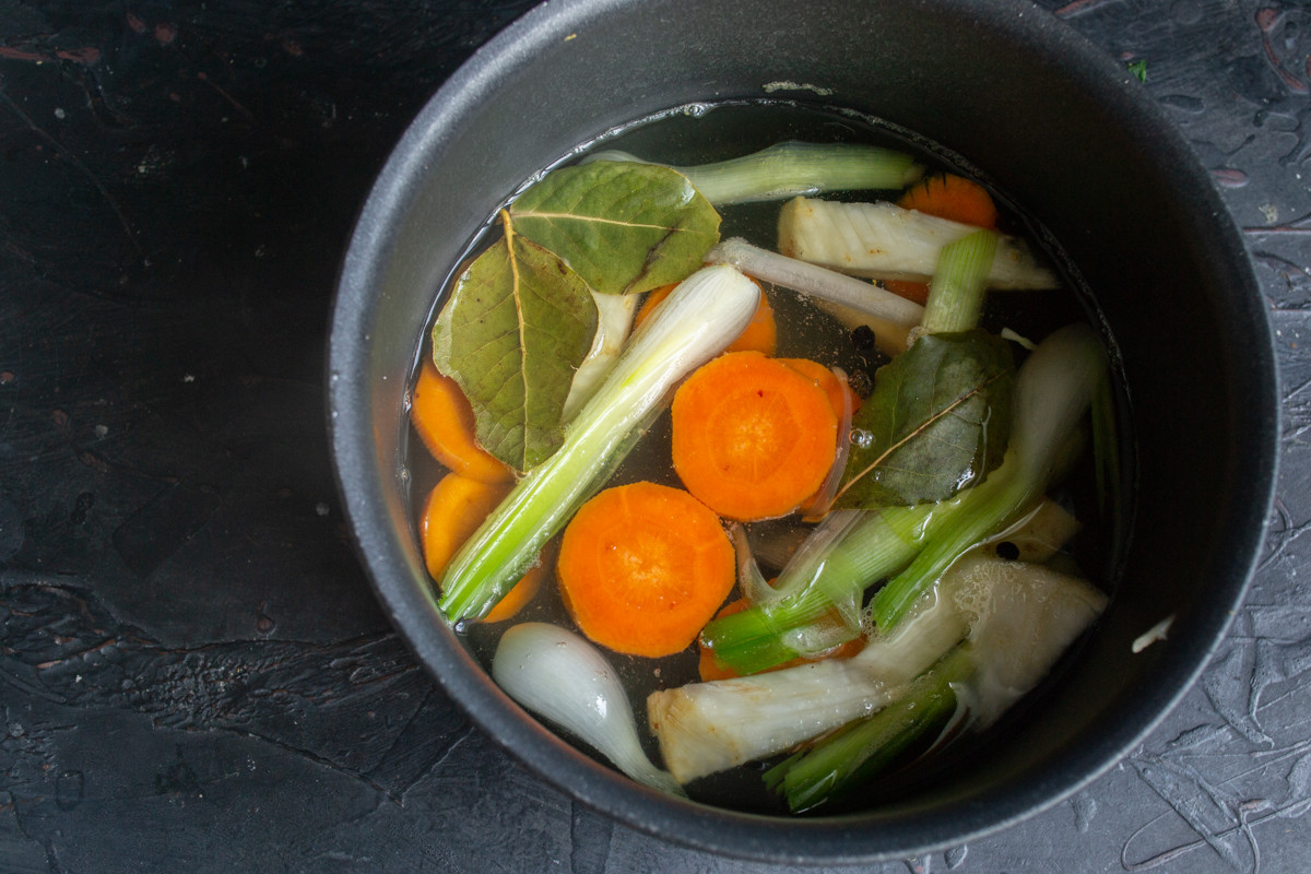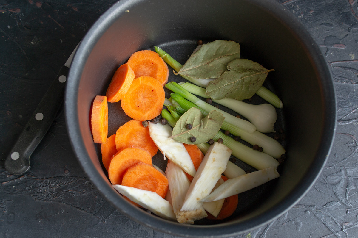 Готовим основу для бульона. Чистим морковь, режем ее толстыми кружочками. Корень сельдерея чистим от кожуры, режем крупно. Кладём в кастрюлю нарезанную морковь, сельдерей, два лавровых листочка и несколько горошин чёрного перца. Добавляем мелкие луковицы или лук-порей, в этом рецепте светлая часть перьев зелёного лука. Летом в заливное из скумбрии можно добавить несколько стрелок чеснока, зимой – один зубчик.