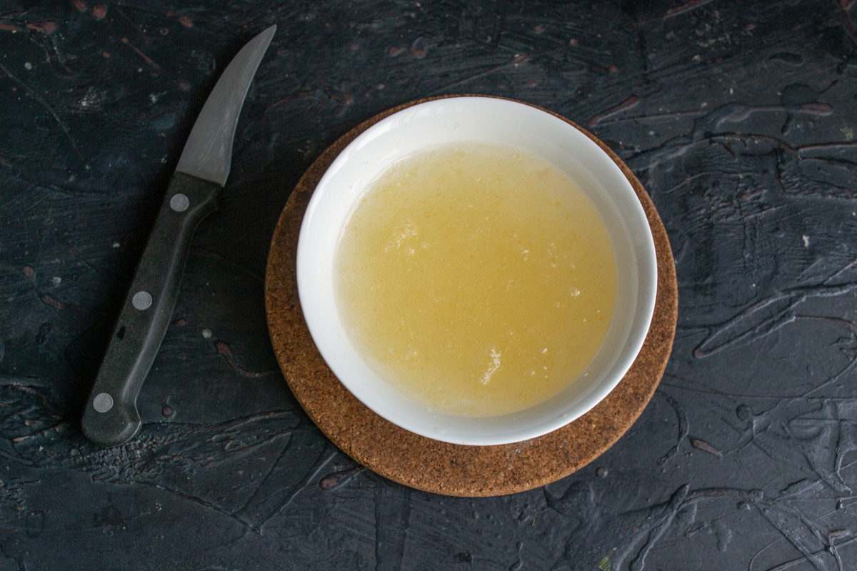 Желатин заливаем 100 миллилитрами холодной воды, оставляем для набухания на 20-30 минут. За это время крупинки желатина практически полностью впитают воду.
