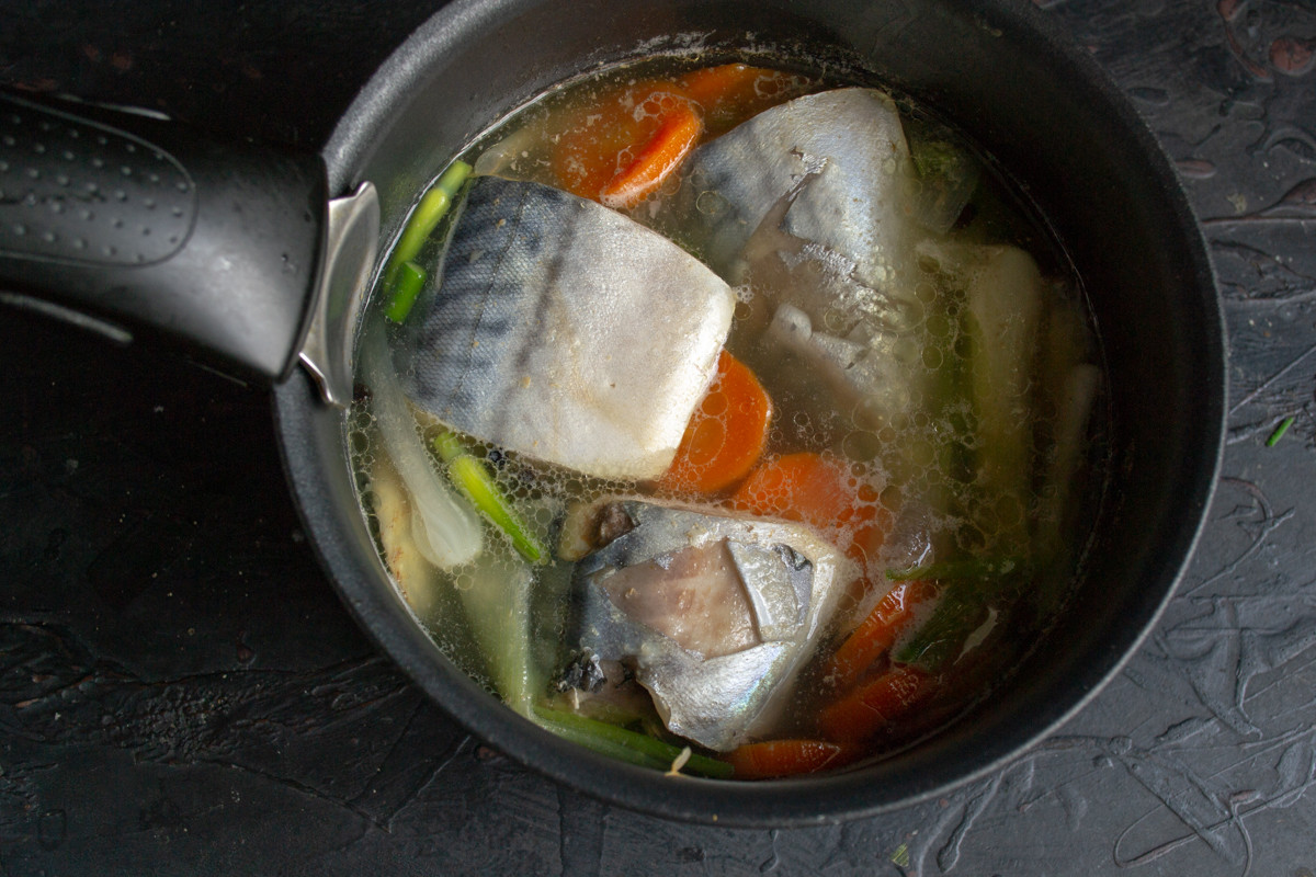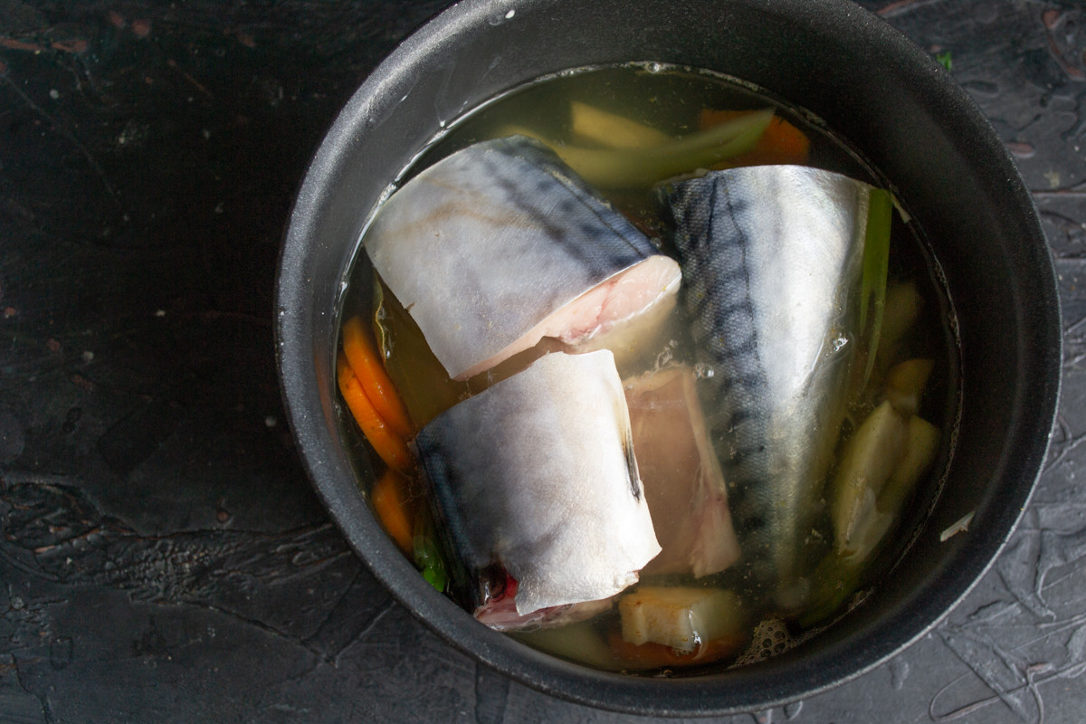 Очищенную скумбрию разрезаем на три части, аккуратно кладём в кипящий бульон. Кстати, по этом рецепту можно готовить не только скумбрию, а марель, тунец, горбуша или лосось тоже подойдут.