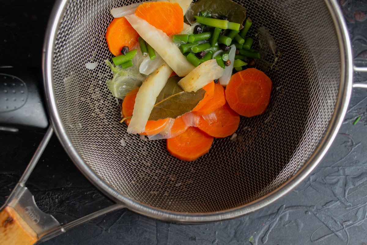 Аккуратно достаём скумбрию из бульона, выкладываем на тарелку. Бульон процеживаем сквозь сито.