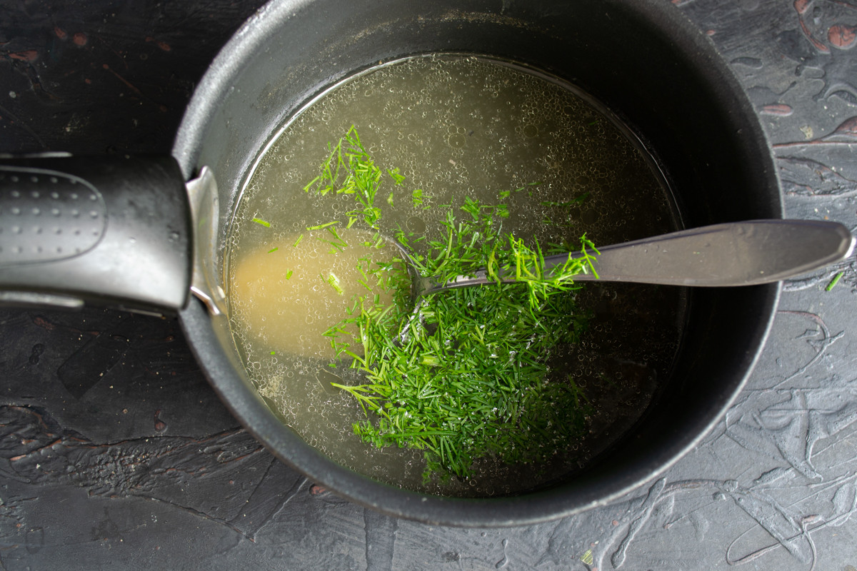 Возвращаем бульон в кастрюлю. Мелко рубим зелень укропа. Нагреваем до кипения, добавляем укроп и набухший желатин. Хорошо перемешиваем и снова нагреваем почти до кипения. Кипятить бульон с желатином не нужно.