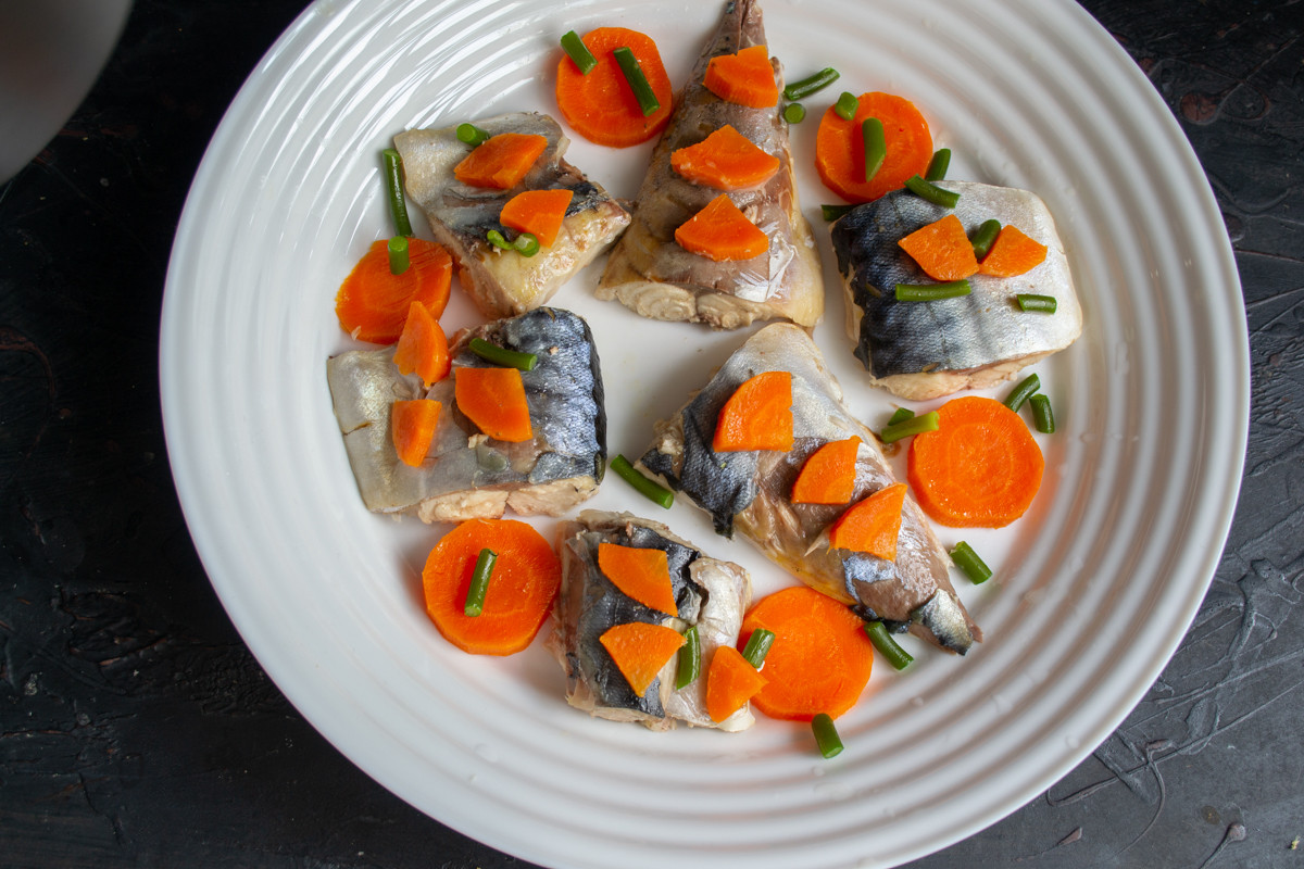 Аккуратно отделяем рыбные косточки от мякоти, благо скумбрия — рыба не костлявая и это сделать легко. На большое блюдо выкладываем кусочки скумбрии кожей вниз. Варёную морковку и чесночные стрелки раскладываем вокруг рыбы хаотически.
