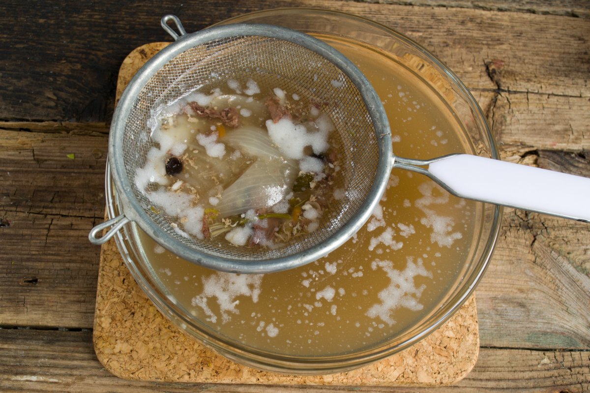 Достаём мясо из бульона, бульон процеживаем через сито, убираем застывший жир.