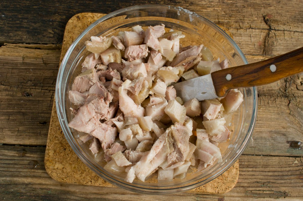 Свинину снимаем с костей. Нарезаем мясо и кожу небольшими кубиками, перемешиваем в миске. Тонкую прослойку сала между кожей и мясом срезать не нужно, на вкус это не влияет, а блюдо получится более нежным и сытным.
