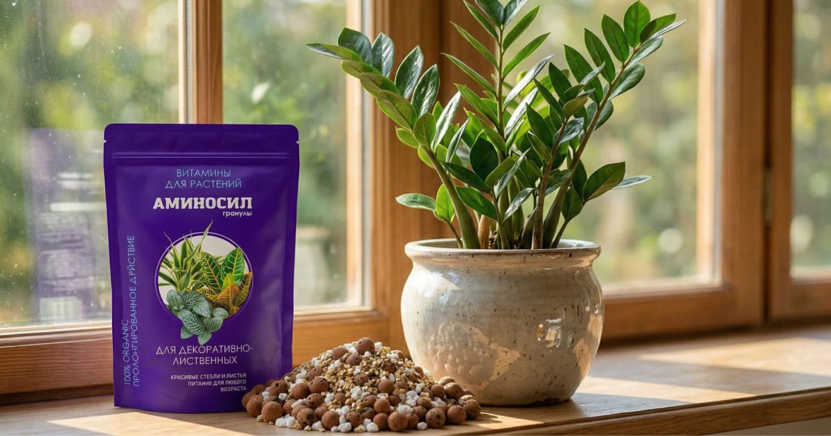 Также следует учесть, что замиокулькасы не любят частых пересадок. А потому при посадке необходимо обязательно это учесть и обеспечить замиокулькас пролонгированным питанием. Для этого в субстрат замешиваем Аминосил для декоративно-лиственных растений в виде гранул. Добавляем 30-60 г (в зависимости от размера) на 1 растение, тщательно перемешиваем. После посадки растения обильно проливаем.