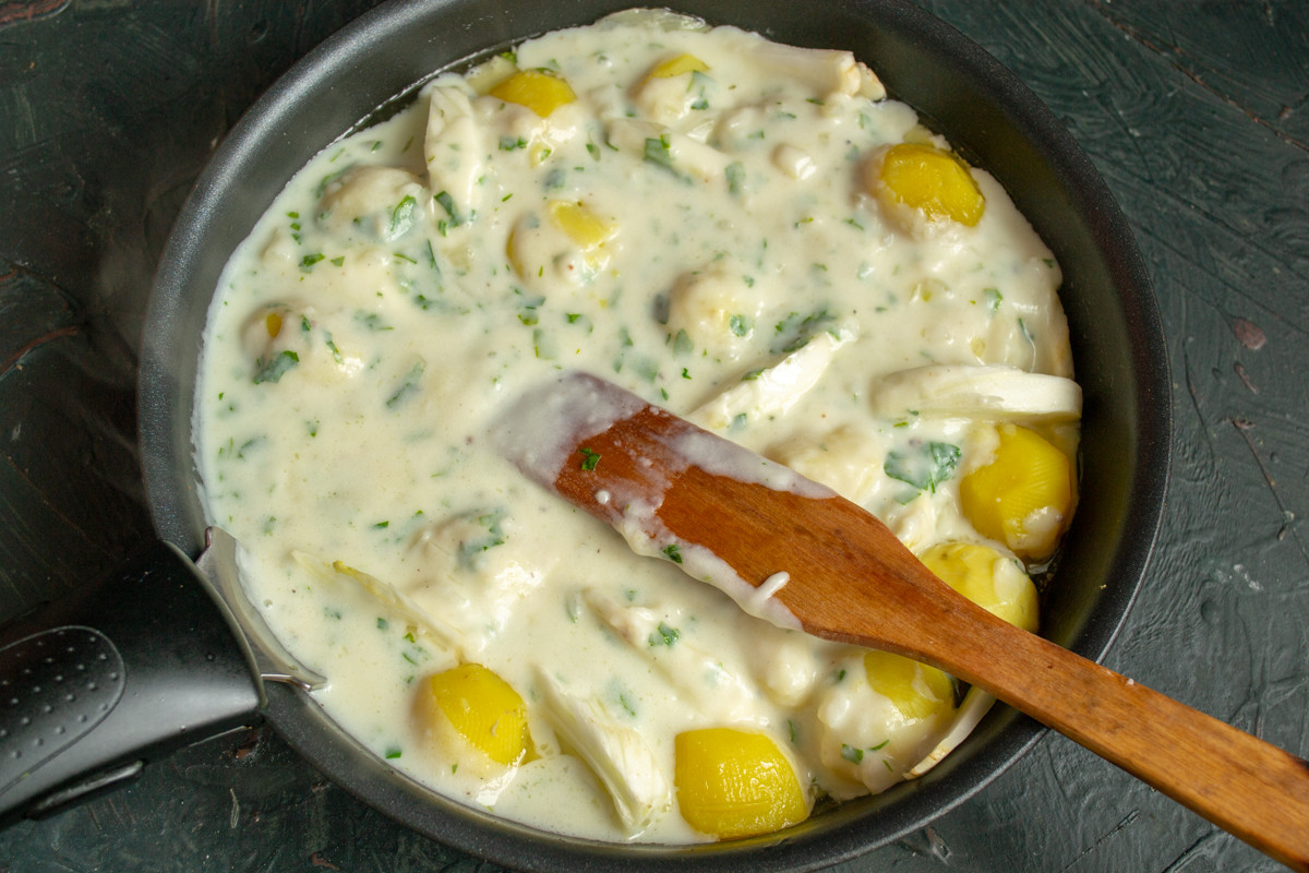 Заливаем картофель и фенхель сливочным соусом, чуть встряхиваем сковороду, чтобы соус равномерно растёкся.