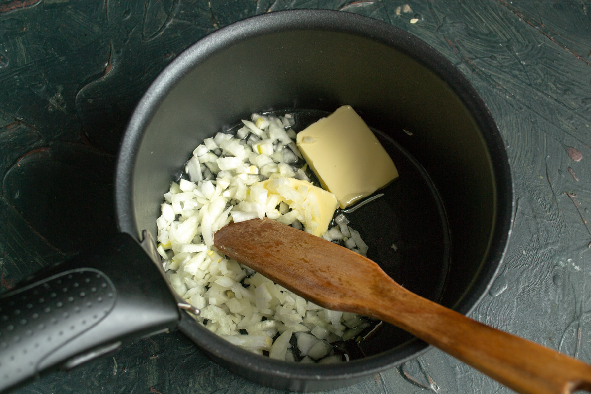 Мелко режем репчатый лук. Зубчик чеснока нарезаем тонкими пластинками. В сотейник наливаем растительное масло, добавляем сливочное. В растопленное масло бросаем лук и чеснок, посыпаем щепоткой соли, обжариваем на тихом огне, пока лук не станет полупрозрачным.
