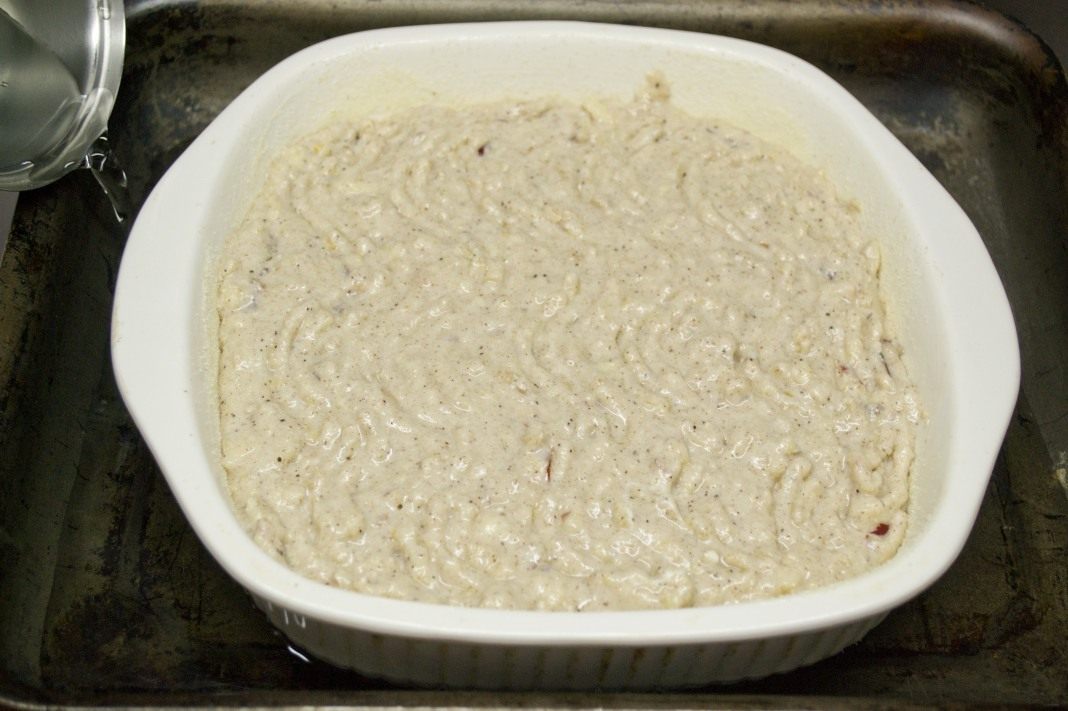 Светлана, поправили текст: «Ставим форму с запеканкой в противень или форму большего размера, наливаем в противень немного горячей воды и отправляем в разогретую духовку.»