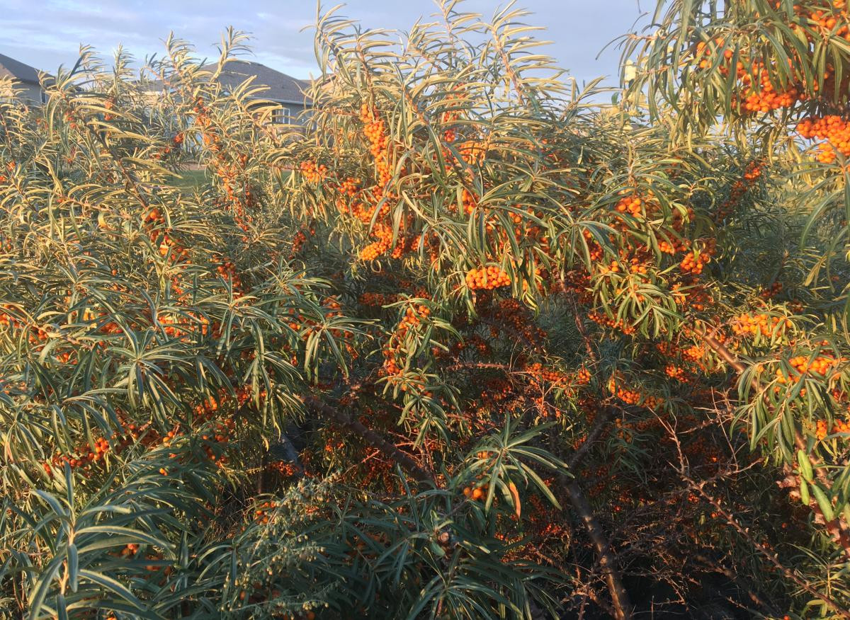 Облепиха – лидер по содержанию полезных веществ и целебным свойствам среди ягодных культур зоны умеренного климата. Её яркие жёлтые или оранжевые плоды богаты витаминами C, A, E, F, B, PP. В них есть каротин, фолиевая кислота, кумарин, дубильные вещества. Масло и ягоды используют при авитаминозе, для борьбы с воспалительными процессами. Наружно для заживления ран и исцеления сыпей, экзем. Плоды собирают в сентябре и октябре.