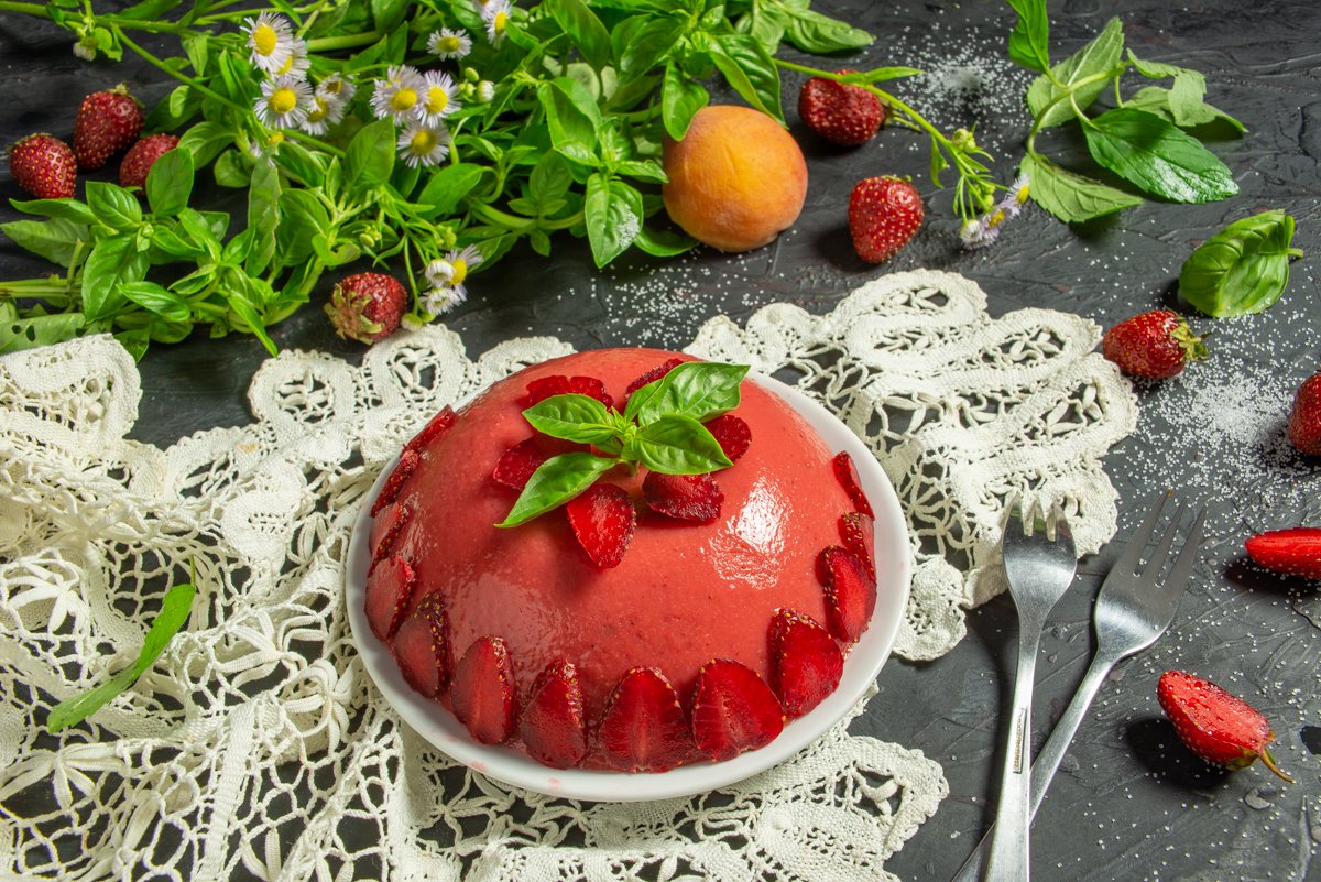 Нарезаем клубнику тонкими ломтиками. Украшаем желе из персиков с клубникой нарезанными ягодами и веточкой лимонного базилика и подаём на стол.