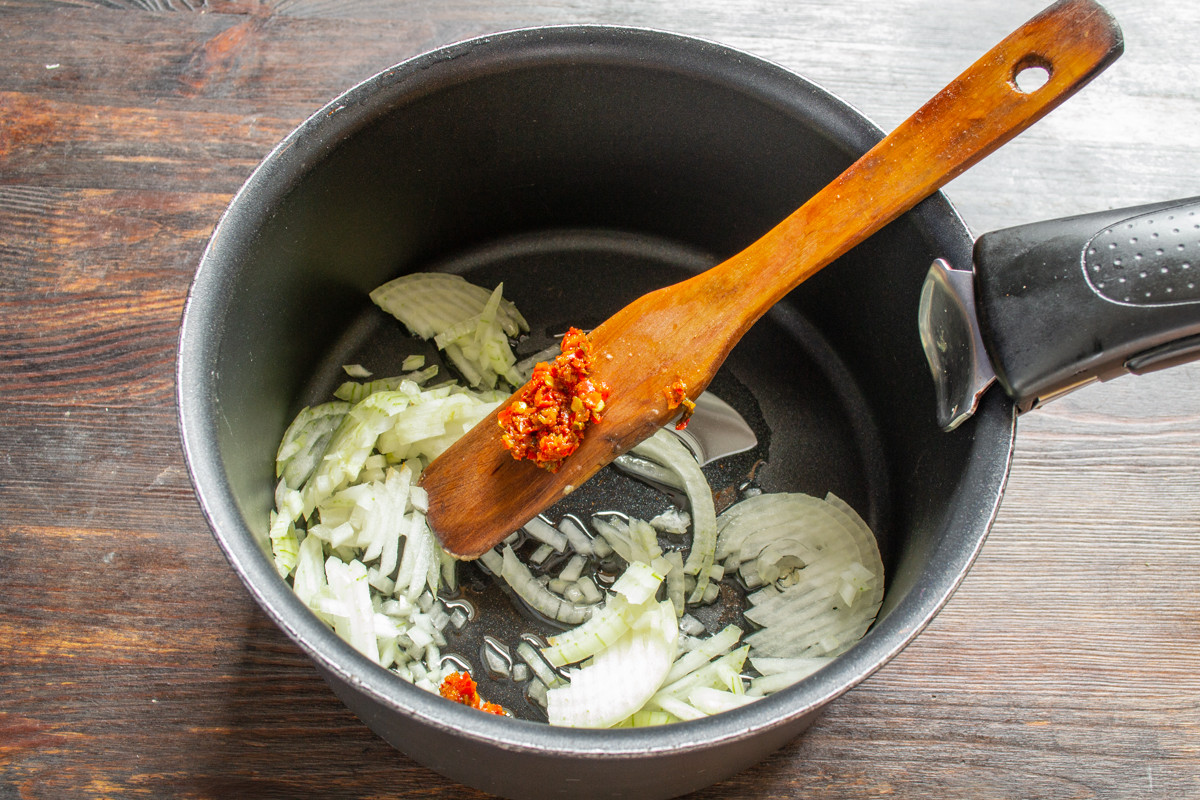 Этот суп варится в одной кастрюле, лишней посуды мыть не придется. В кастрюлю наливаем столовую ложку подсолнечного или растительного масла. В разогретое масло бросаем мелко нарезанную луковицу. По желанию добавляем 1/2 чайной ложки аджики из острого перца, обжариваем лук на среднем огне 5 минут до мягкости. Если готовите для детей или не любите острую еду, то вместо аджики возьмите зубчик чеснока, нарезанный мелко и щепотку сладкой паприки.