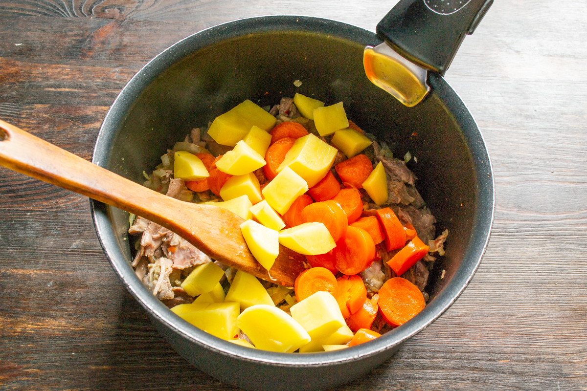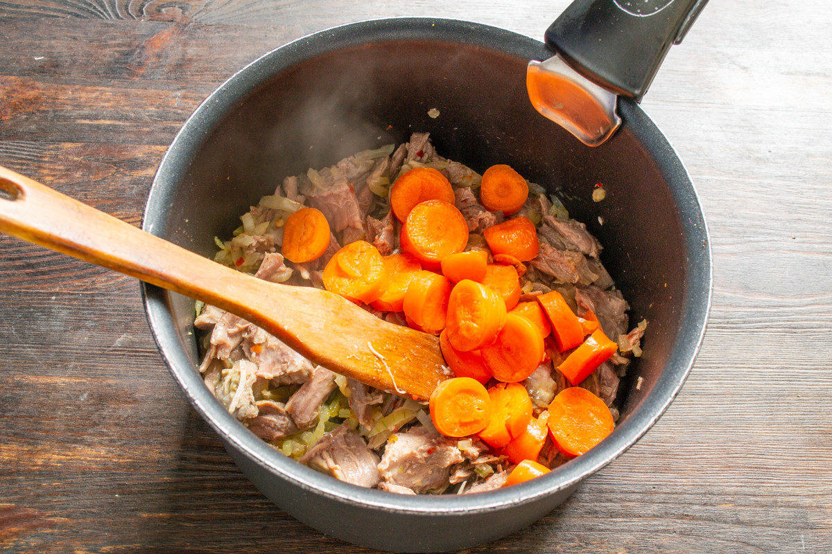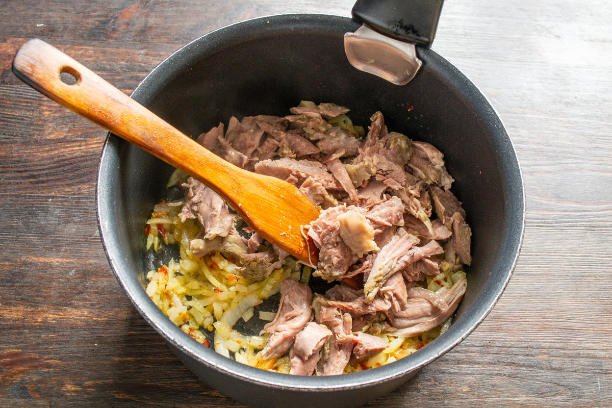 Нежирное вареное мясо разрываем на волокна, бросаем в кастрюлю к луку. Обжариваем мясо с луком ещё 5 минут.