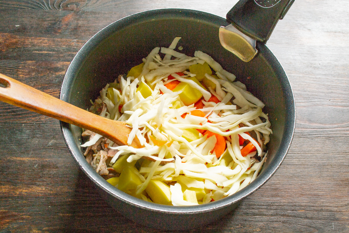 Далее добавляем в суп нашинкованную узкими полосками капусту. Весной готовьте с ранней капустой, летом капусту можно заменить ботвой редиски или свекольной ботвой. Молодую ботву нужно добавлять в суп за 5-7 минут до готовности.