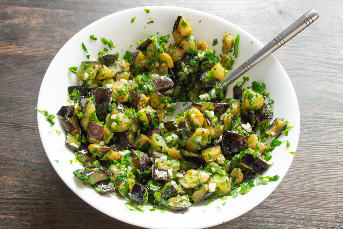 Наливаем 2 чайные ложки яблочного или 6% уксуса, тщательно перемешиваем и баклажаны с чесноком и петрушкой готовы. Если не готовите блюда с уксусом, то замените его свежевыжатым лимонным соком, понадобится 1 столовая ложка сока. Можно есть баклажаны сразу, но я советую дать закуске созреть. Через несколько часов или на следующий день будет вкуснее.