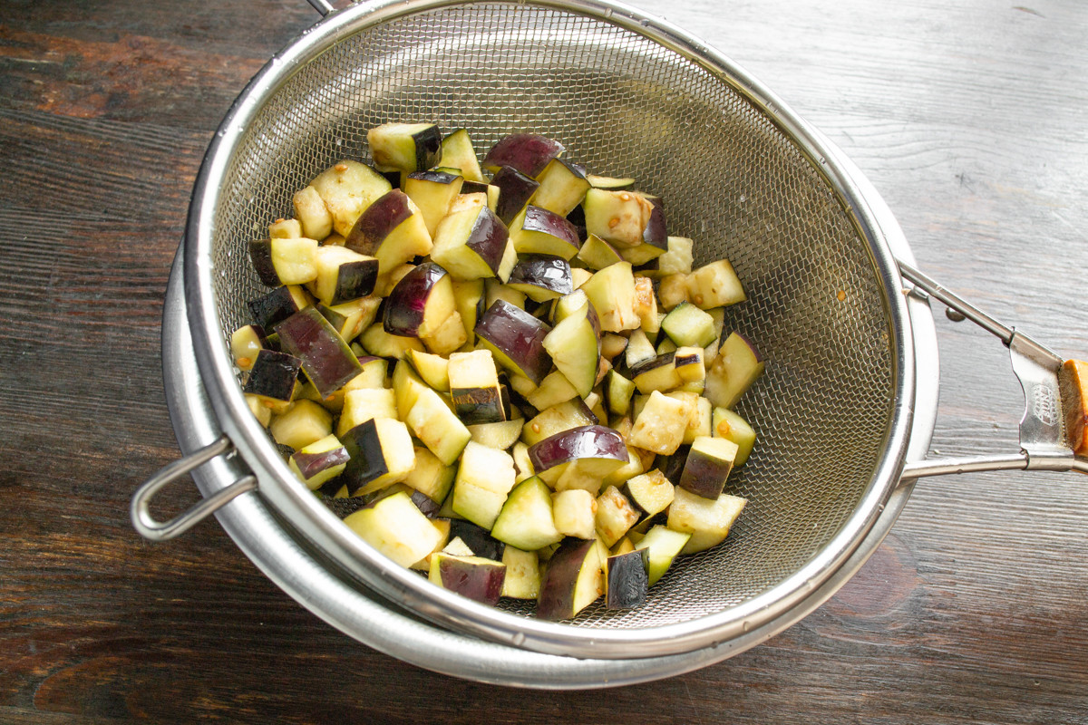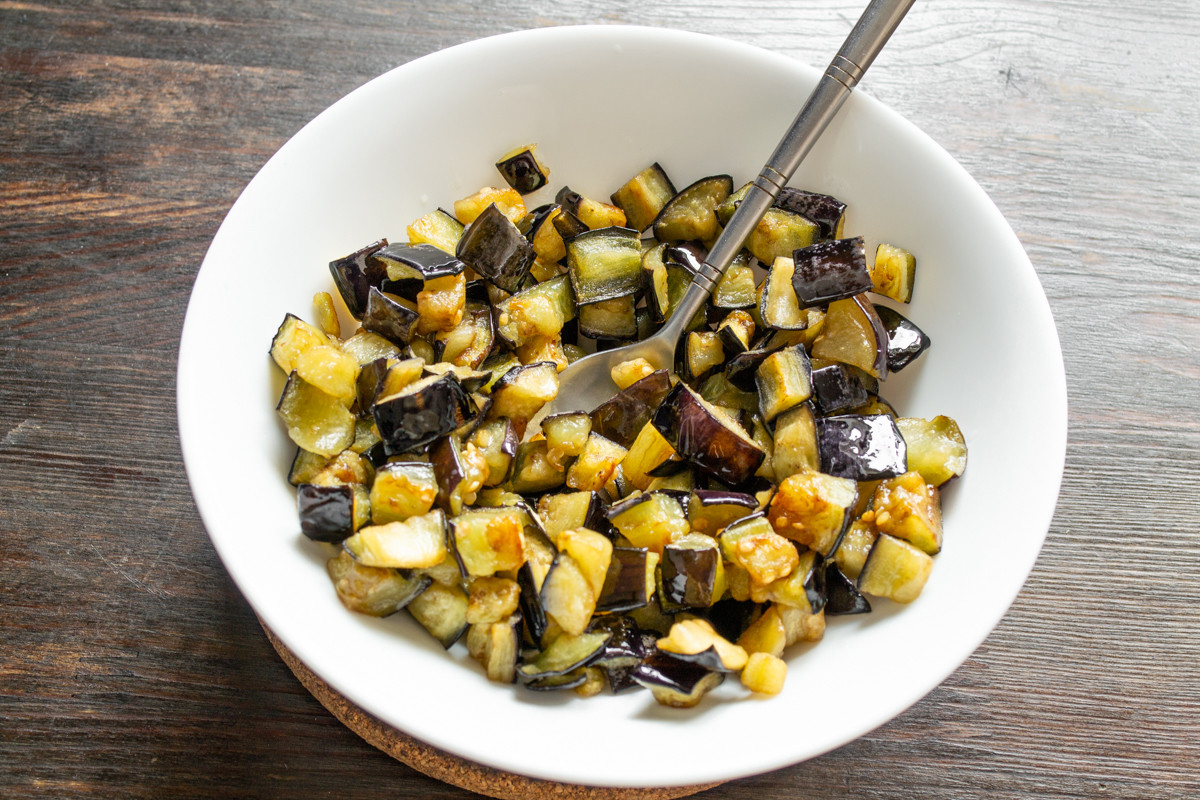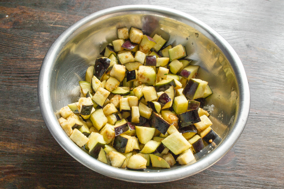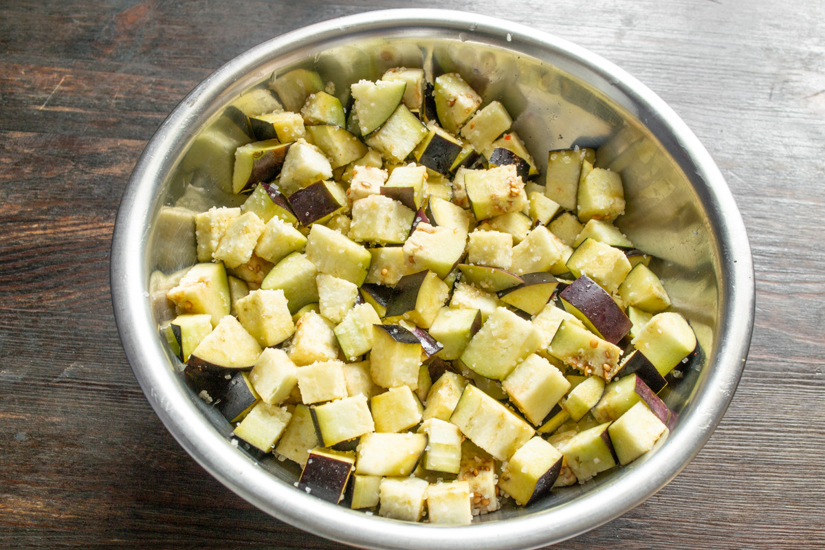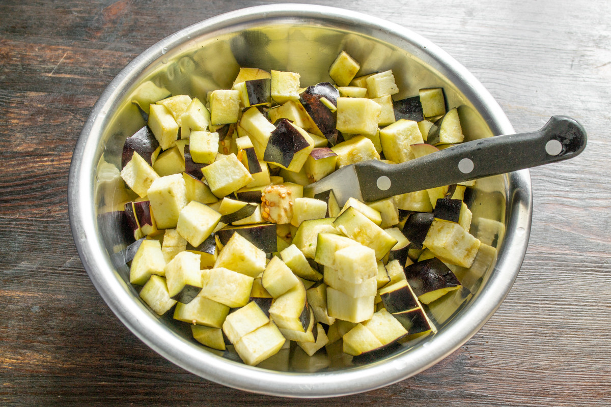 Выбираем плотные тёмно-фиолетовые баклажаны с упругой мякотью, без пятен и повреждений на кожуре. Отрезаем плодоножки, тщательно моем овощи, обсушиваем. Нарезаем подготовленные баклажаны кубиками размером чуть больше одного сантиметра.